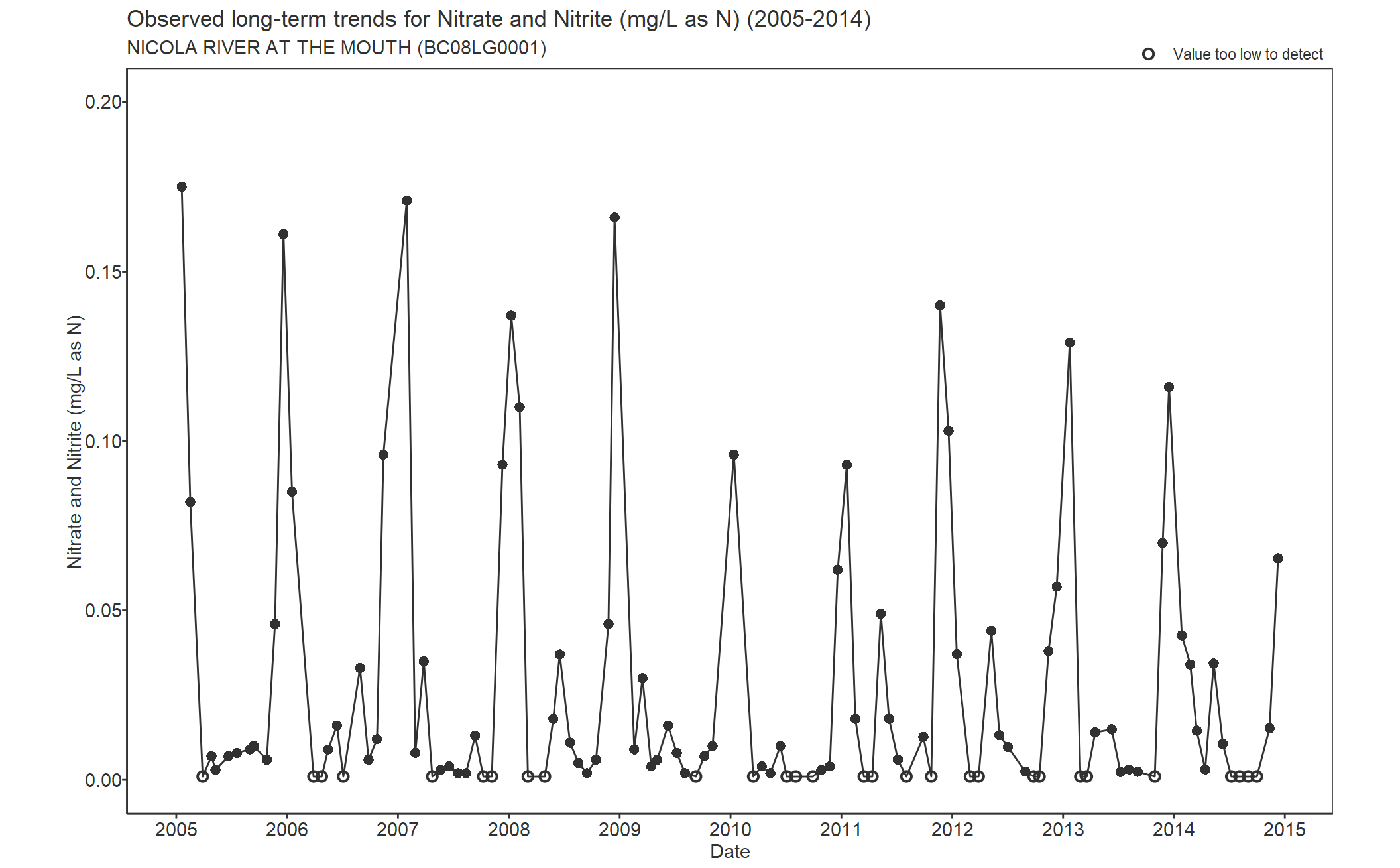 We collect water samples from the river and send them to a laboratory to be analysed for specific water quality parameters. The solid circles ( ● ) on the graph represent concentration values above the laboratory detection limit. The detection limit is the lowest concentration that the laboratory can report for a given parameter. The value of an open circle ( ○ ) on the graph is not the true concentration of a parameter in the water but half of the detection limit because the actual concentration is below what the laboratory can measure. We call this a “value too low to detect”. The detection limit can change over time as laboratories improve their instruments or methods leading to multiple detection limits for a single parameter in the dataset. In this case, the “value too low to detect” will be graphed as half of the highest detection limit.
