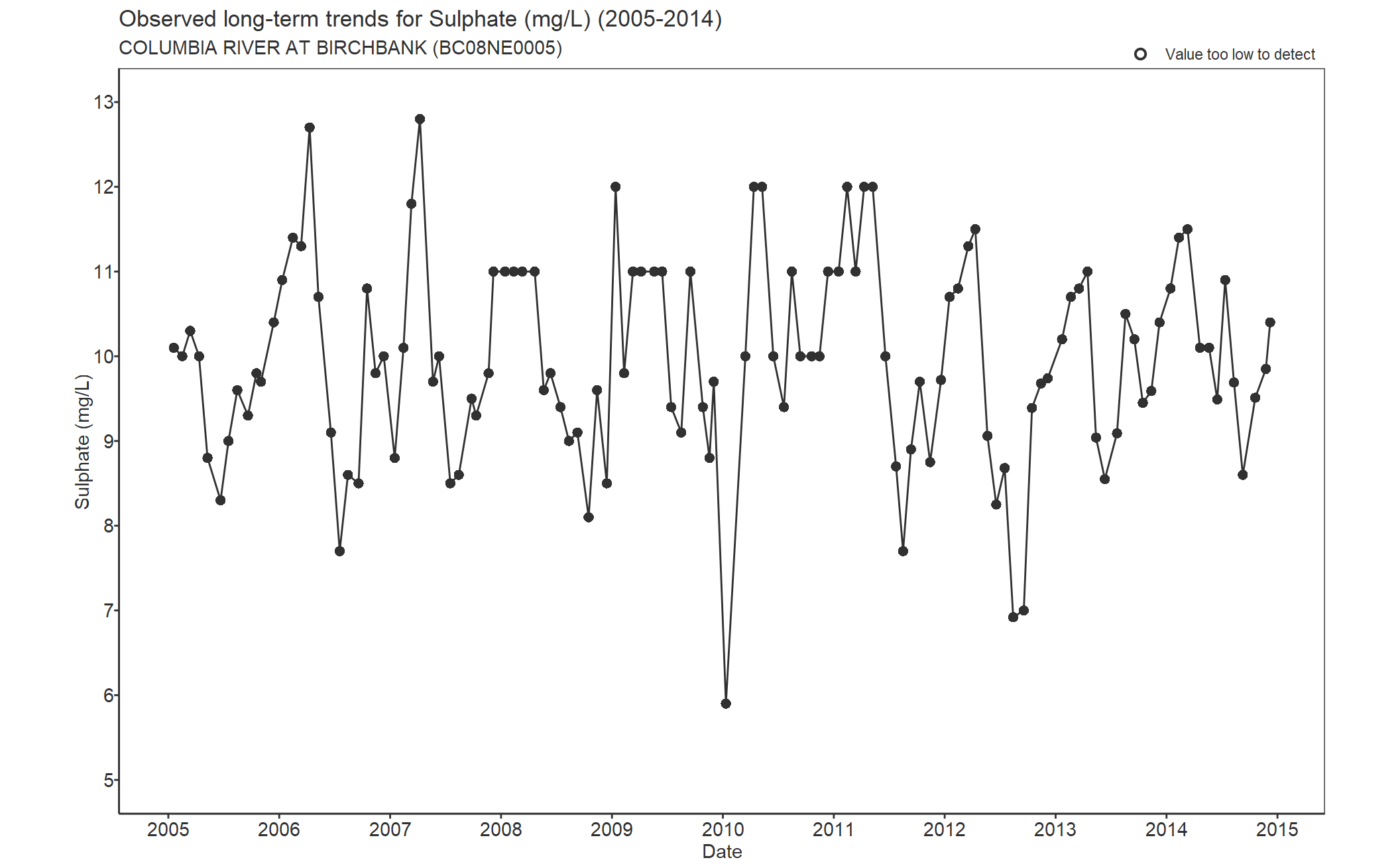 British Columbia and Canada operate a network of water quality monitoring stations that measure concentrations of specific parameters in river water. These include metals, major ions, nutrients, physical properties and bacteria. Data was evaluated for trends between 2005 and 2014.