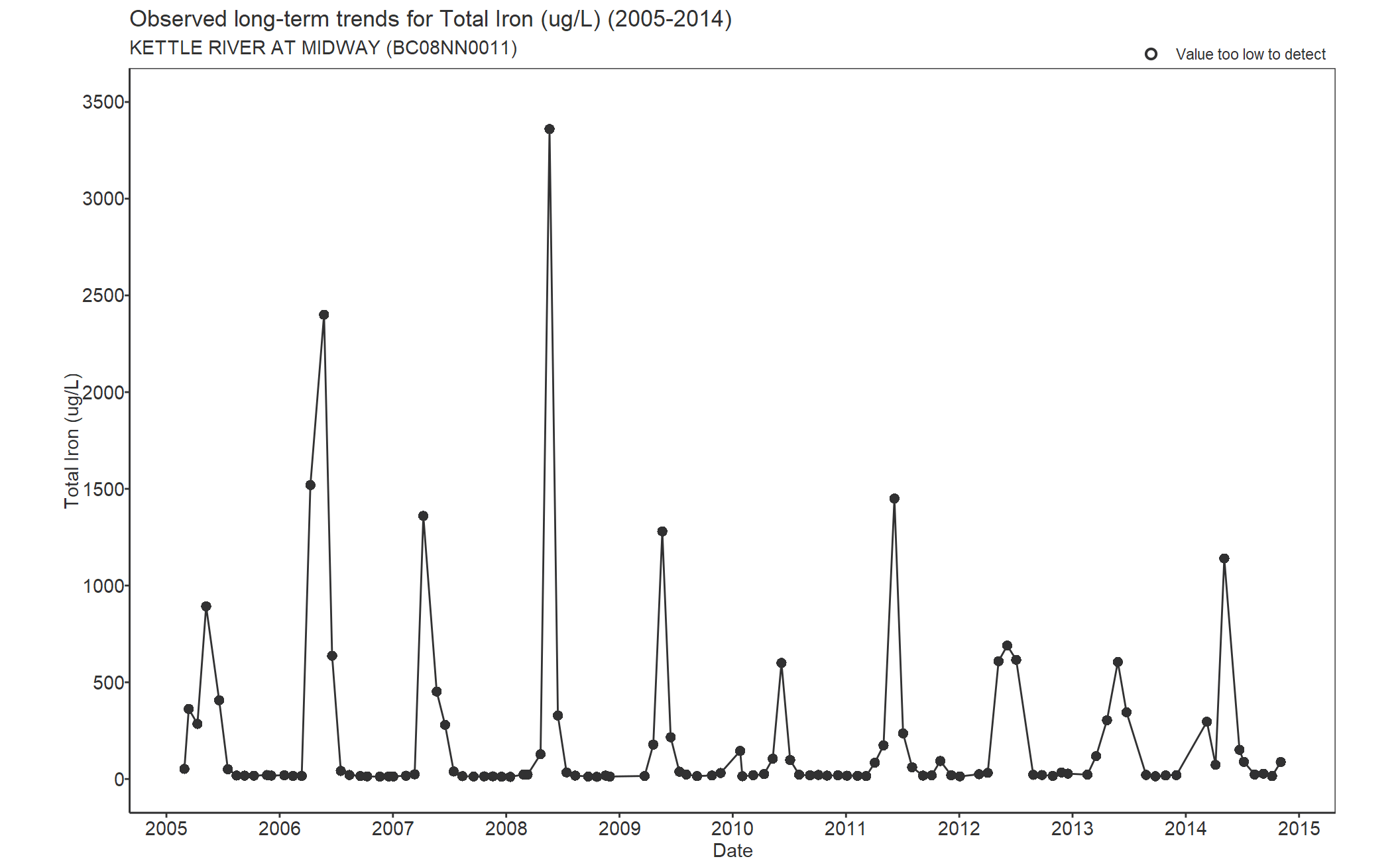 We collect water samples from the river and send them to a laboratory to be analysed for specific water quality parameters. The solid circles ( ● ) on the graph represent concentration values above the laboratory detection limit. The detection limit is the lowest concentration that the laboratory can report for a given parameter. The value of an open circle ( ○ ) on the graph is not the true concentration of a parameter in the water but half of the detection limit because the actual concentration is below what the laboratory can measure. We call this a “value too low to detect”. The detection limit can change over time as laboratories improve their instruments or methods leading to multiple detection limits for a single parameter in the dataset. In this case, the “value too low to detect” will be graphed as half of the highest detection limit.