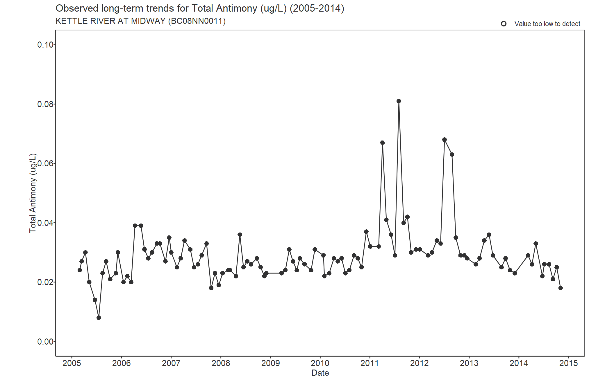 British Columbia and Canada operate a network of water quality monitoring stations that measure concentrations of specific parameters in river water. These include metals, major ions, nutrients, physical properties and bacteria. Data was evaluated for trends between 2005 and 2014.