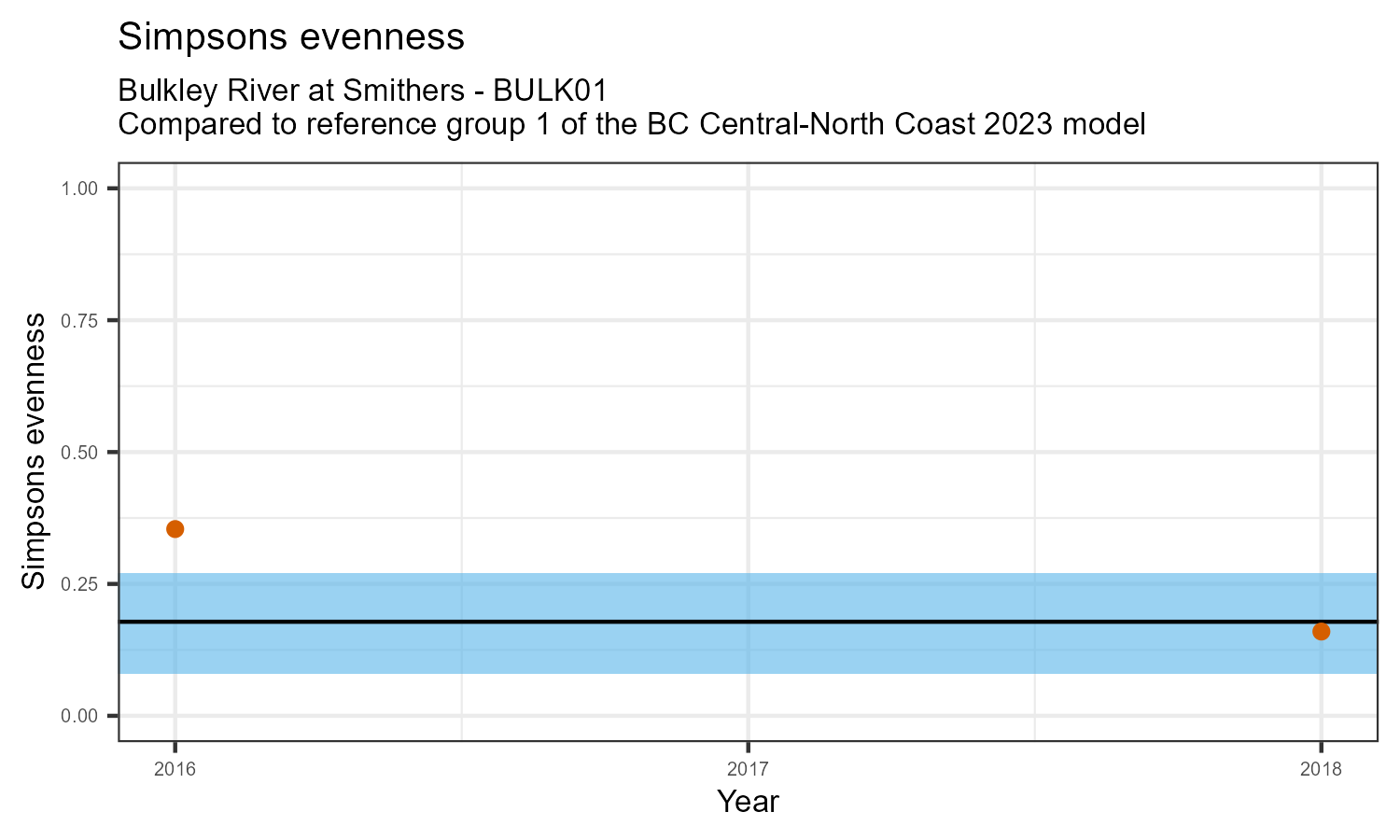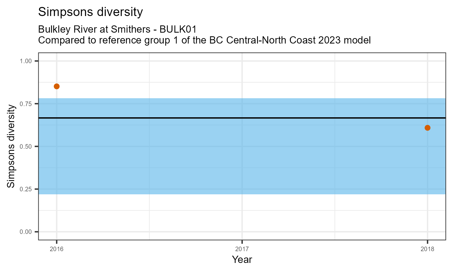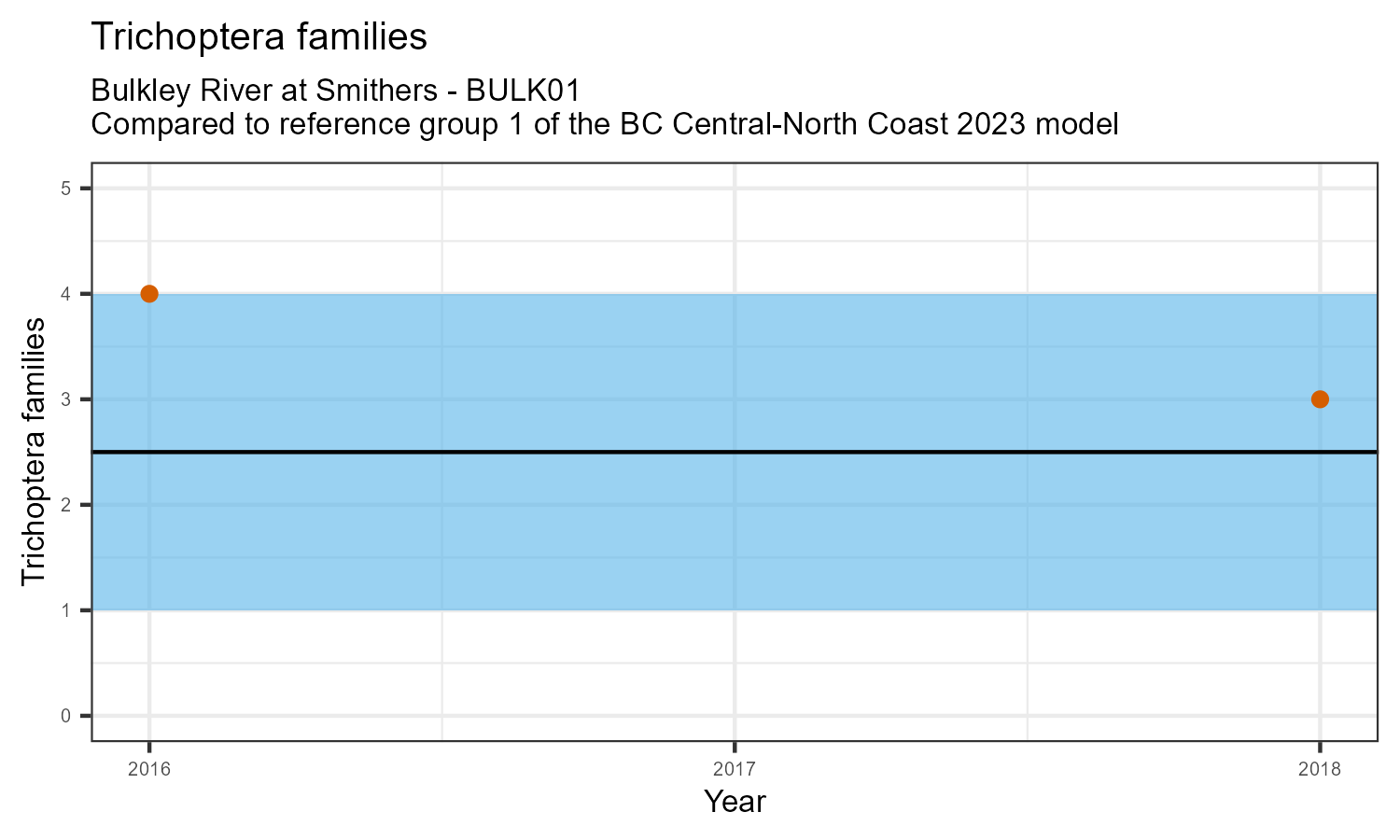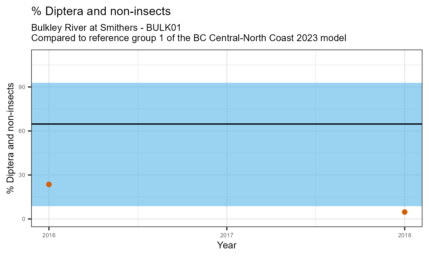 The biological condition at this station was assessed for 2018, the most recent year of sampling. The benthic macroinvertebrate community was analysed by comparing it to similar sites in a CABIN reference model for the BC Central and North coast region.