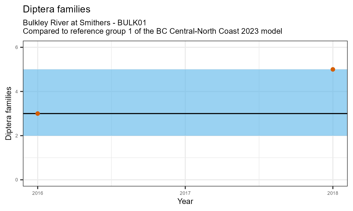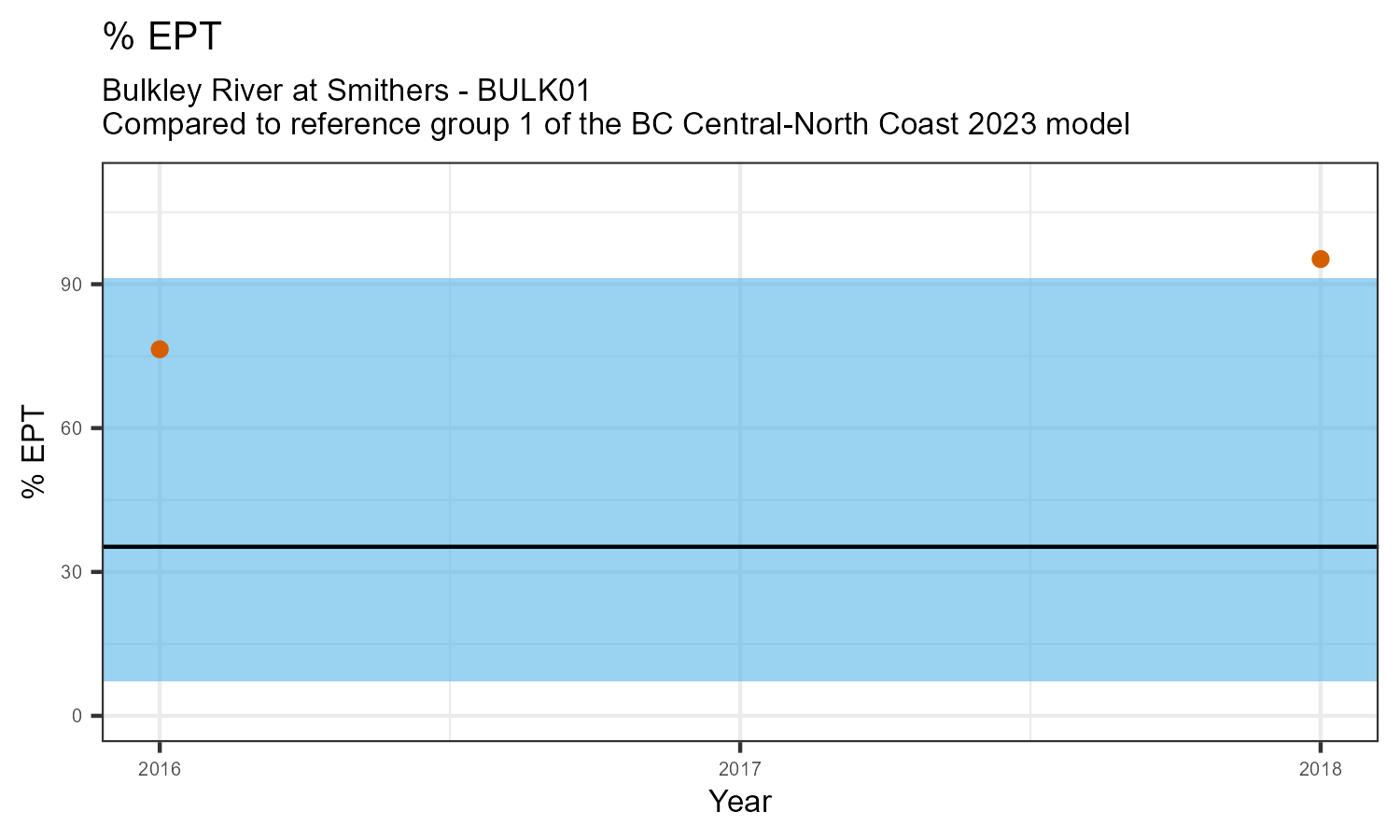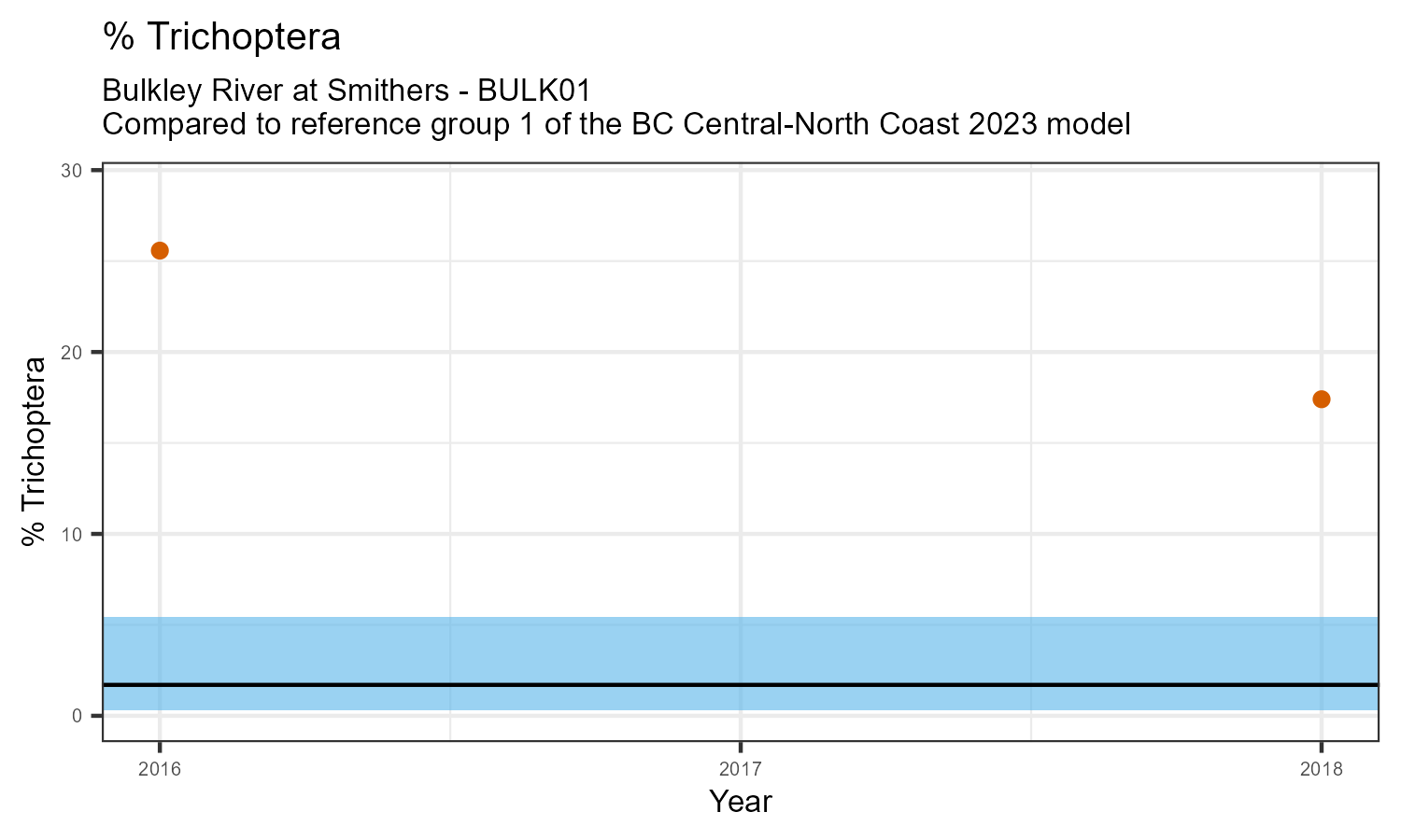 The biological condition at this station was assessed for 2018, the most recent year of sampling. The benthic macroinvertebrate community was analysed by comparing it to similar sites in a CABIN reference model for the BC Central and North coast region.