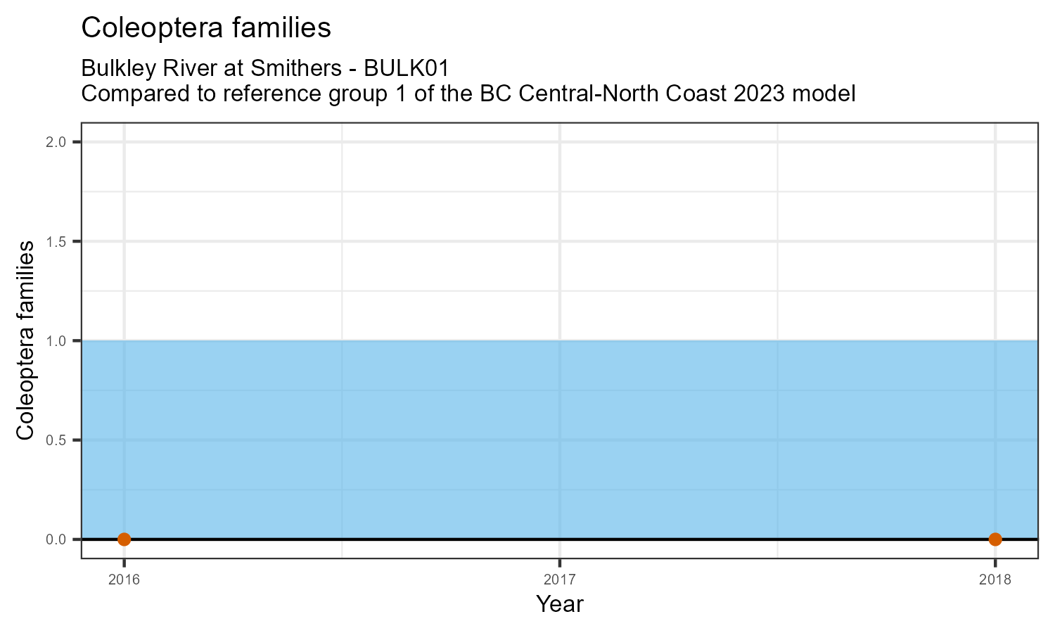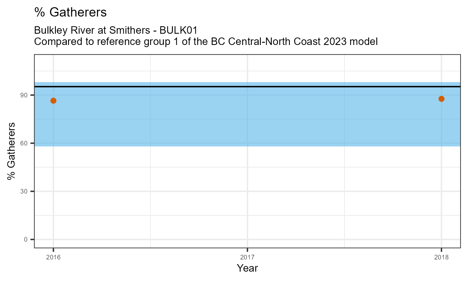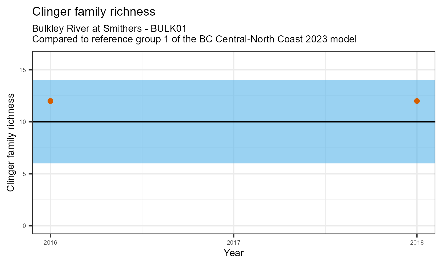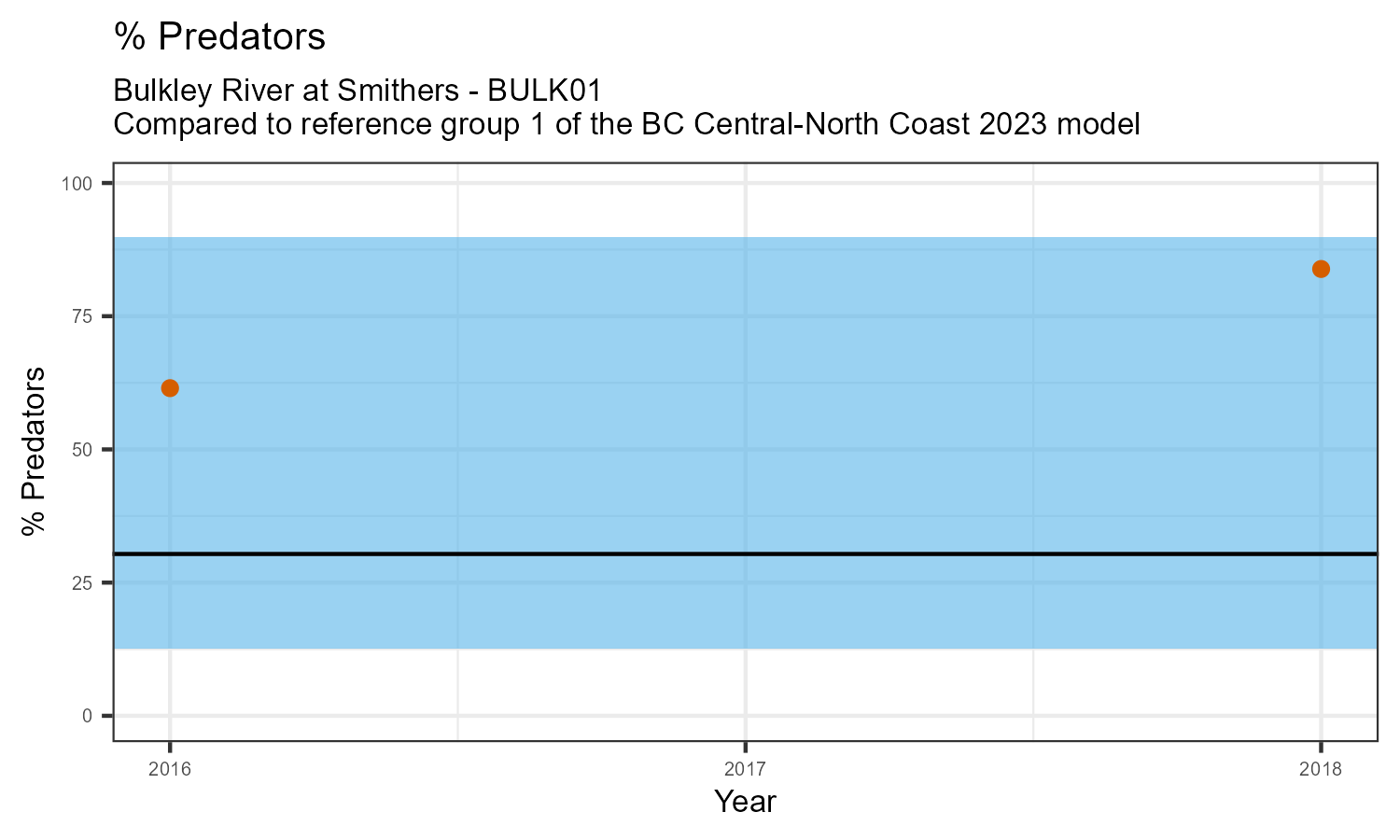 The biological condition at this station was assessed for 2018, the most recent year of sampling. The benthic macroinvertebrate community was analysed by comparing it to similar sites in a CABIN reference model for the BC Central and North coast region.