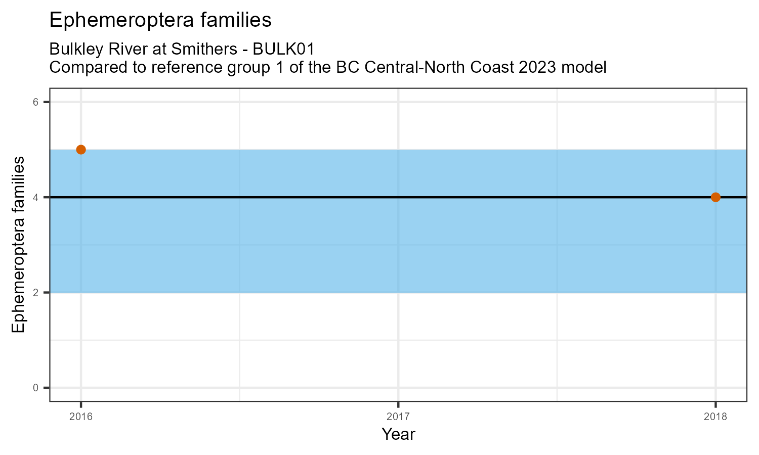 The number of families observed at this station was divided by the number of families found at more than half of similar reference sites. In 2018 the O:E ratio for this station was 0.94.