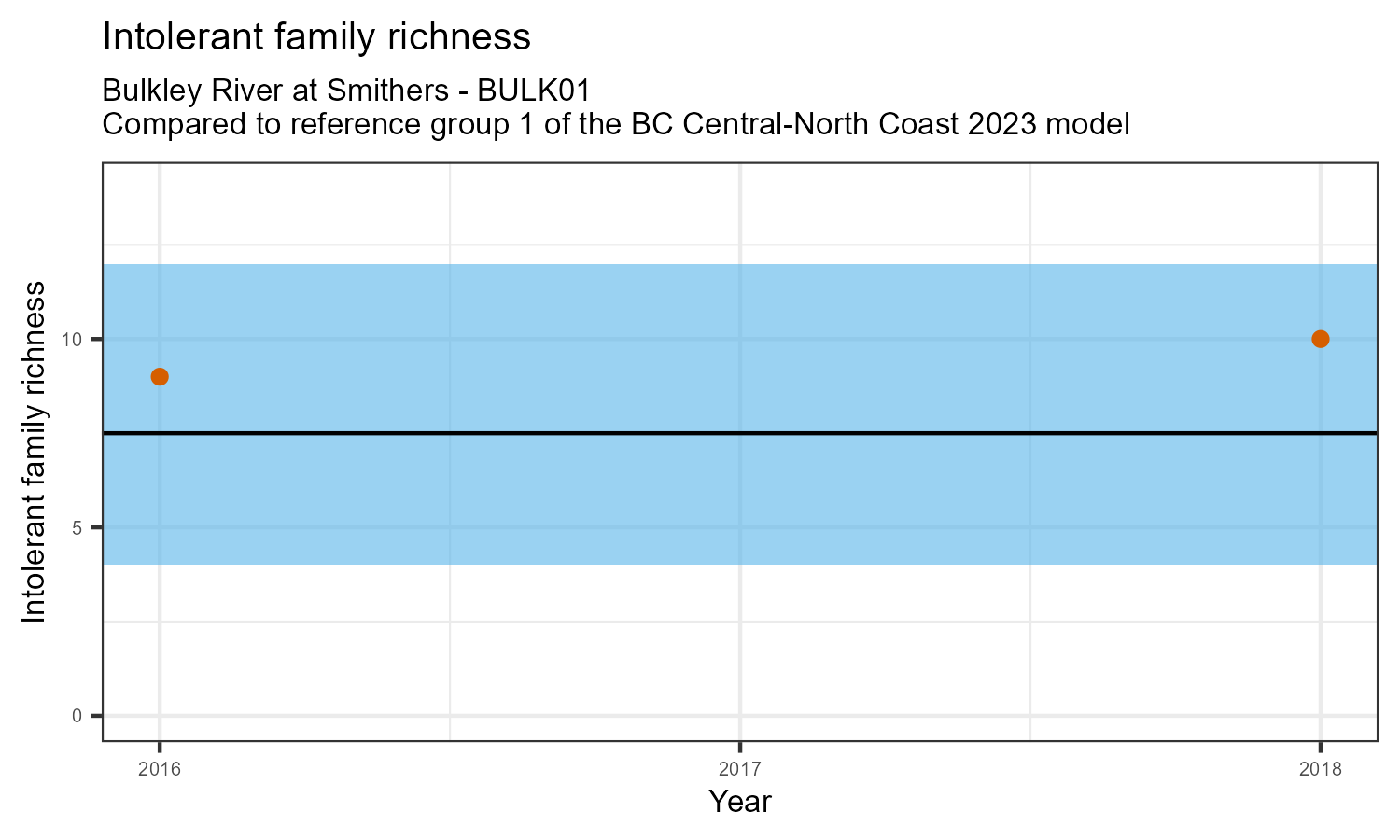 Intolerant family richness counts the number of taxonomic families that are sensitive (intolerant) to pollution, according to the Hilsenhoff Biotic Index. Intolerant family richness may decrease as water pollution increases.