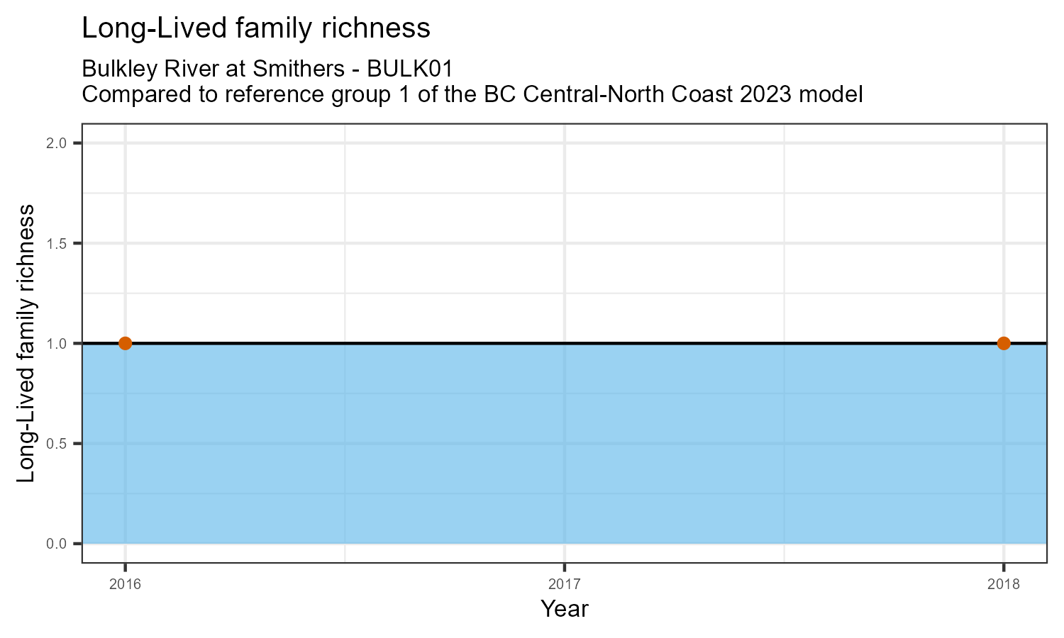 Long-lived family richness counts the number of taxonomic families that need more than 1 year to complete their life cycle. These families have been exposed to conditions in the water over a longer period. They provide information on historical and current water quality conditions. The number of long-lived families may decrease in response to habitat disturbances like poor water quality.