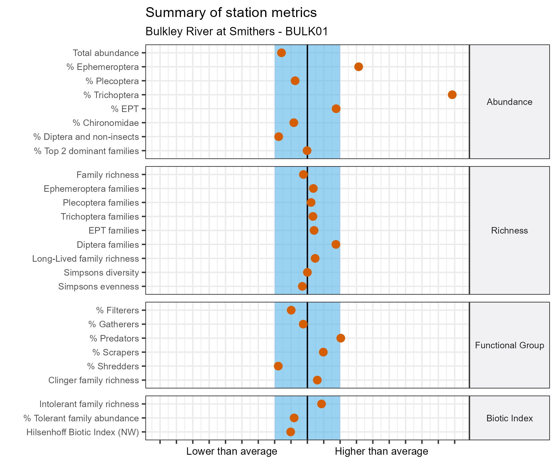 For each metric shown in the graph, the value at this station has been standarized by the standard deviation of the values from the relevant reference model group (in this case, Group 1 of the BC Central-North Coast 2023 reference model). The black line represents the mean value for that metric in the reference group. The blue bar represents two standard deviations of the reference group above and below the mean.