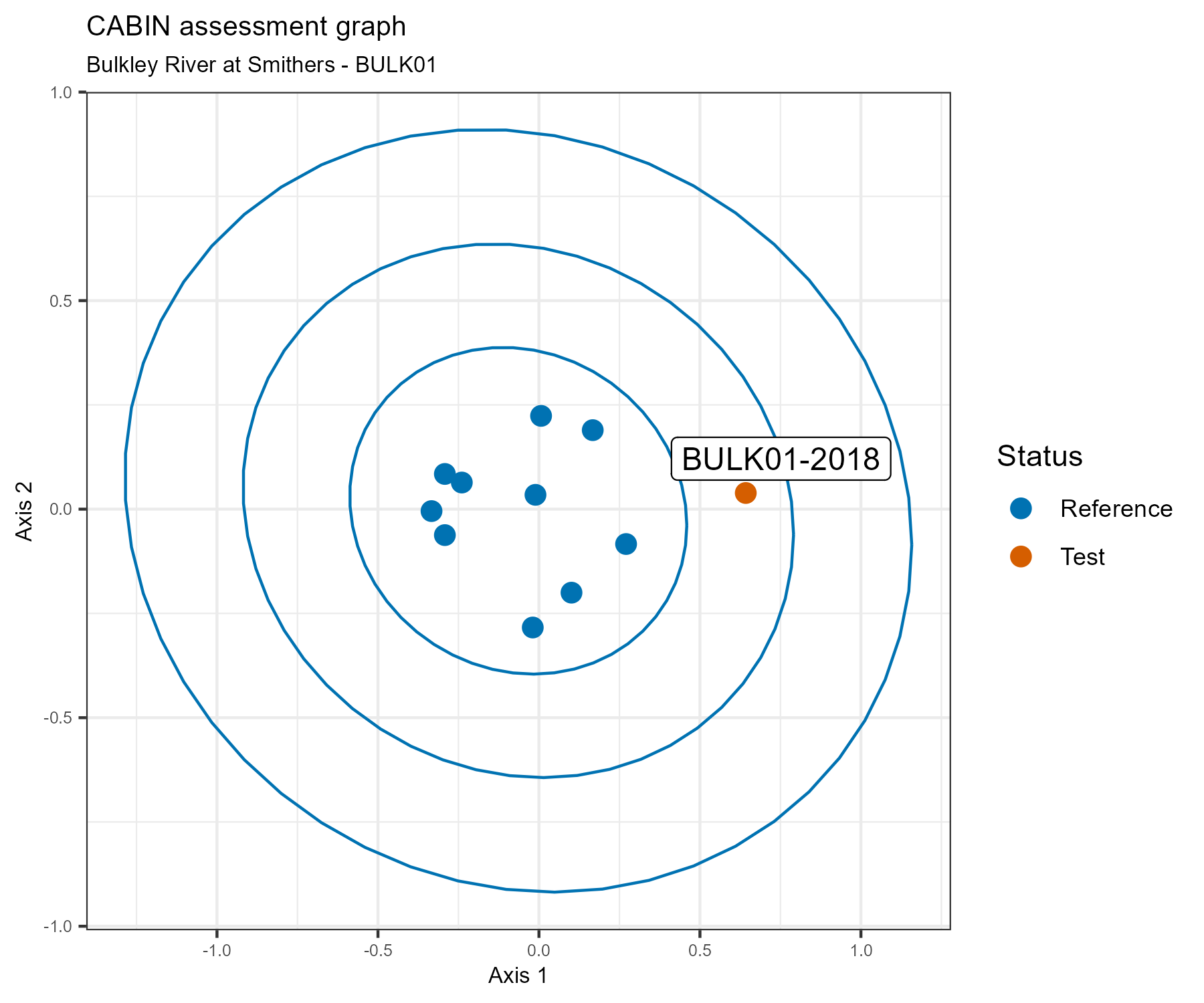 A CABIN assessment considers this water quality monitoring station the “test” site, and compares it to a group of sites with similar habitat features from the BC Central-North Coast 2023 CABIN reference model. Sites in the reference model have little or no human activity in their watersheds, so they are considered to represent pristine or best possible biological conditions. If the test site is close to the reference sites on the plot, it is also considered to be in good biological condition.