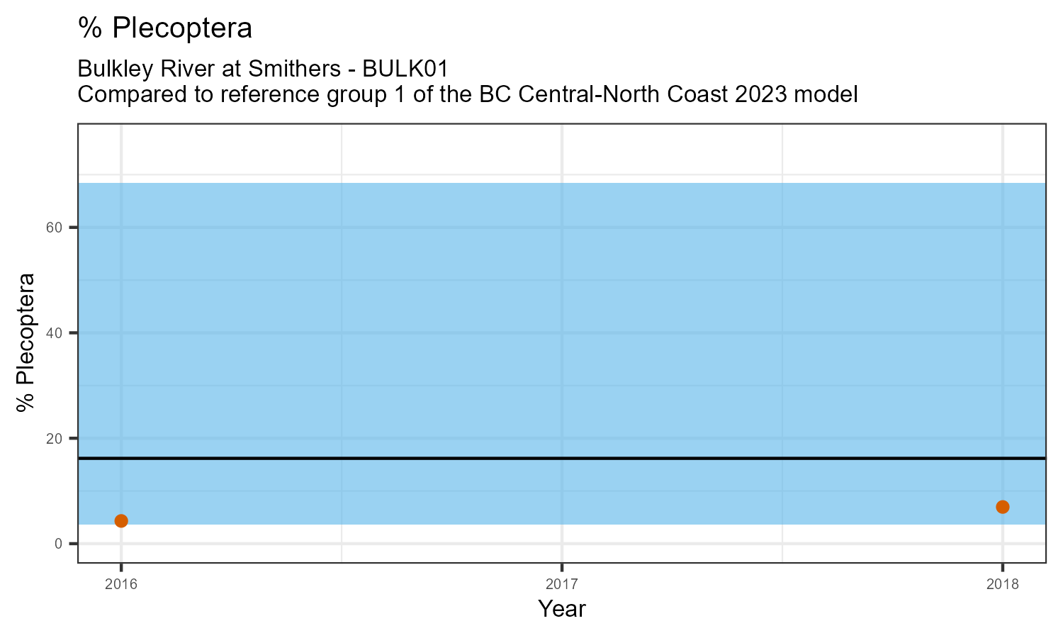 % Plecoptera is the proportion of invertebrates that belong to the taxonomic order Plecoptera. Plecoptera are commonly called stoneflies. They are sensitive to pollution. The % Plecoptera may decrease in response to habitat disturbances like poor water quality.