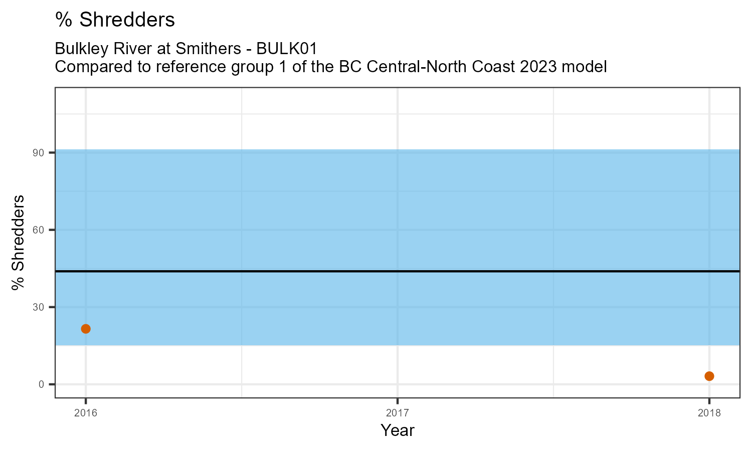 % Shredders is the proportion of taxonomic familes present that feed on leaf litter and other coarse particulate organic matter in the water. The proportion of shredders is expected to decrease at a site in response to disturbance.
