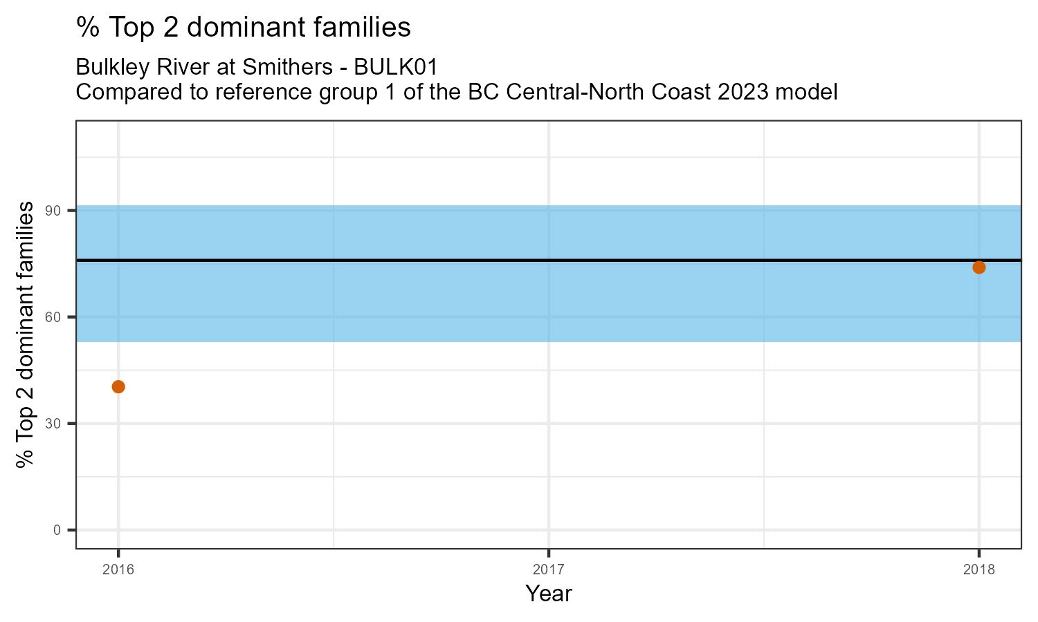 % Top 2 dominant families is the proportion of the total sample represented by the two most abundant families of invertebrates. A healthy aquatic community should have a balance of many types of invertebrates. If only one or two families dominate the community, this can be a sign of habitat disturbance. The percentage of the two most dominant families in the community may increase in response to disturbance.
