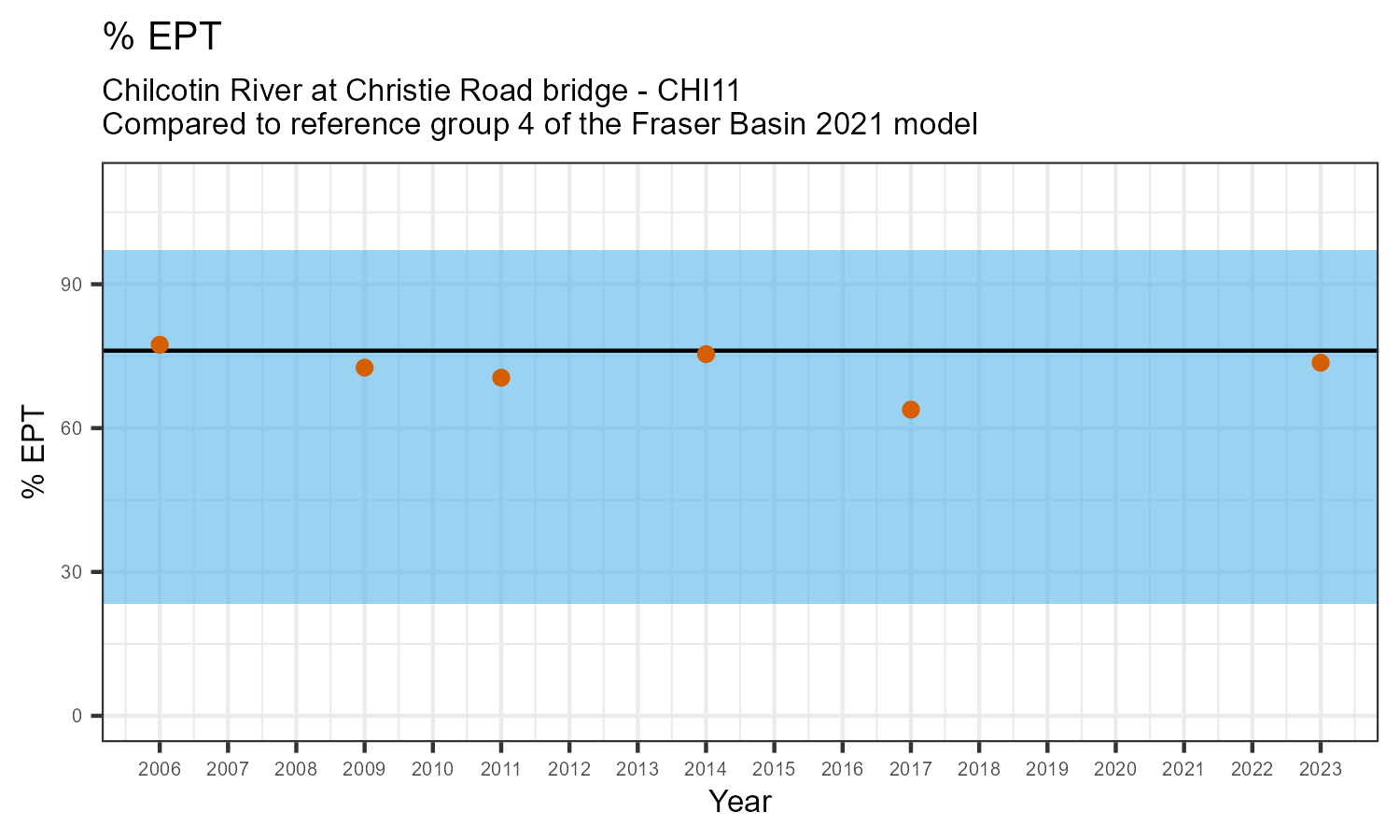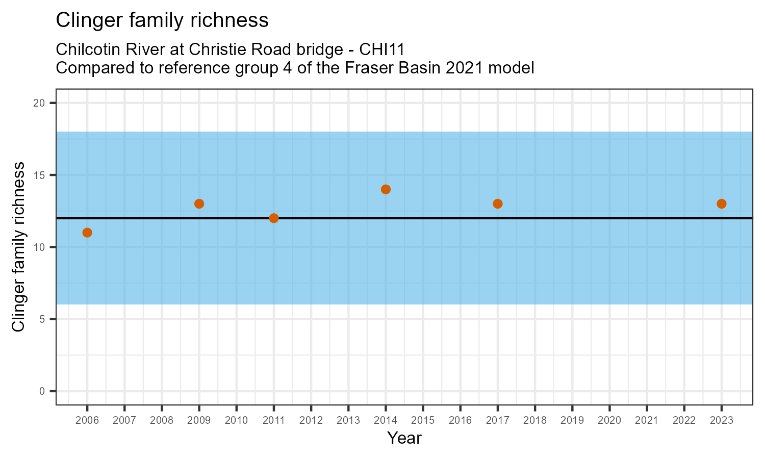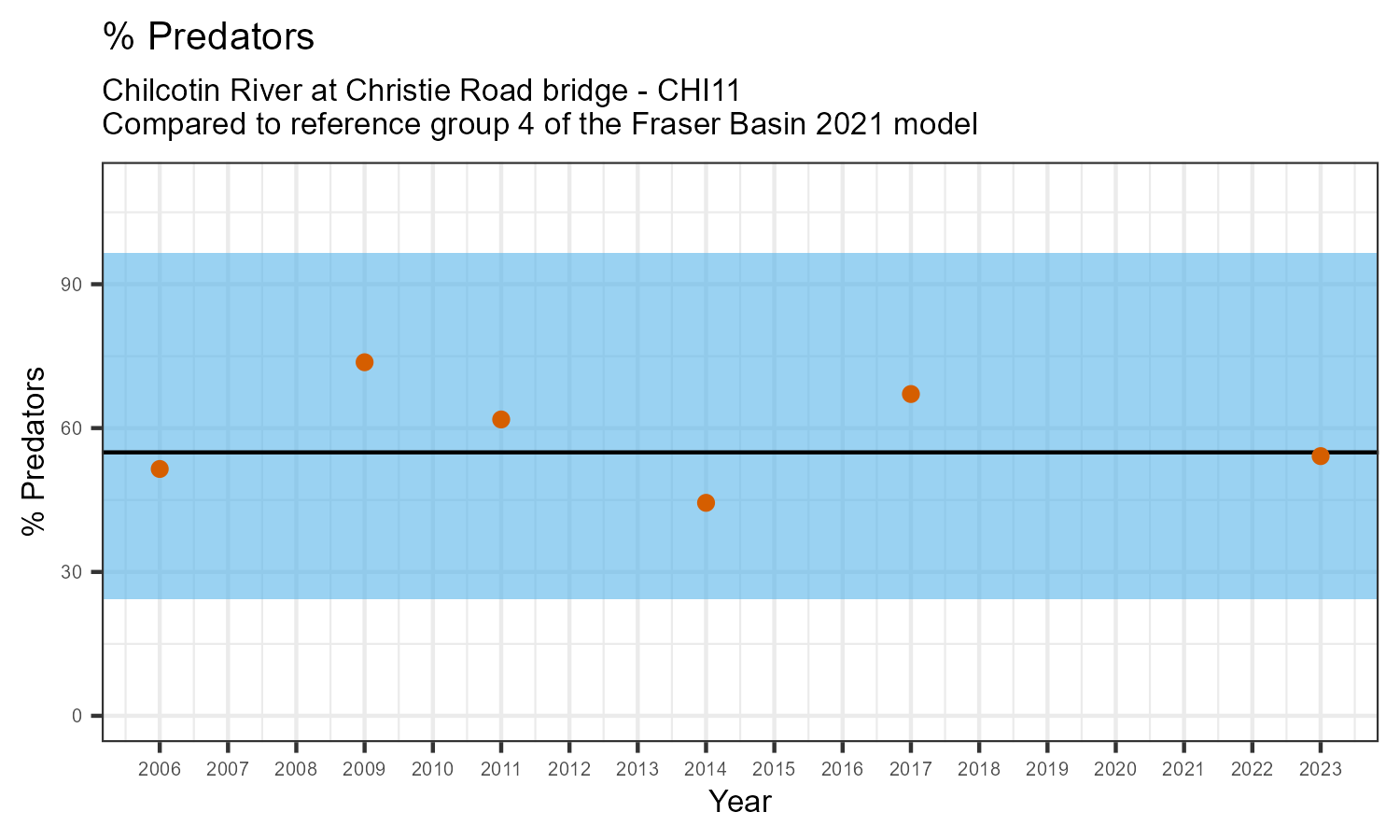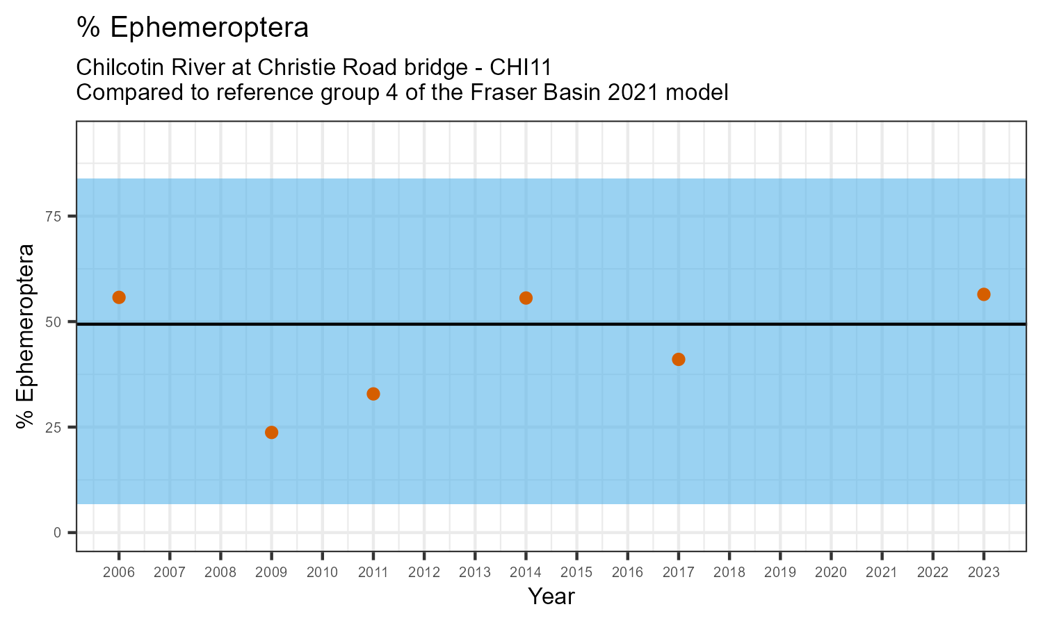 The biological condition at this station was assessed for 2023, the most recent year of sampling. The benthic macroinvertebrate community was analysed by comparing it to similar sites in a CABIN reference model for the Fraser River basin.