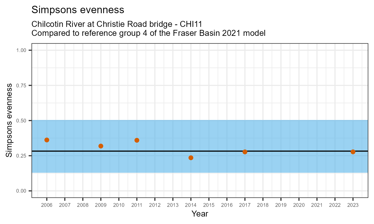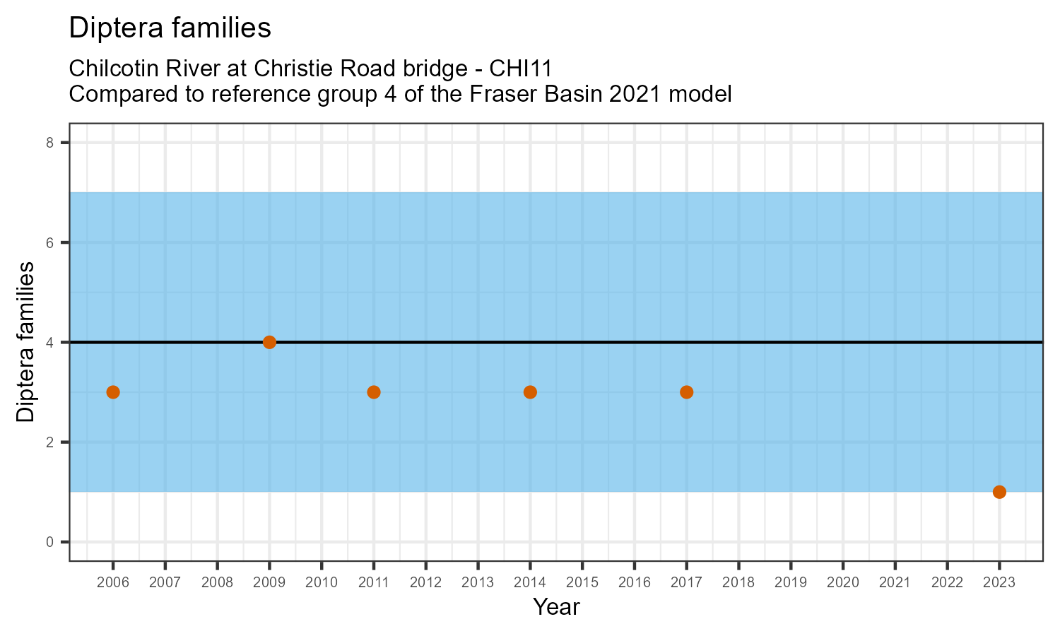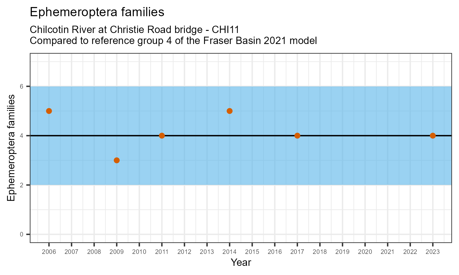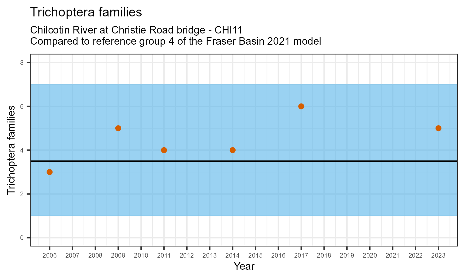 The number of families observed at this station was divided by the number of families found at more than half of similar reference sites. In 2023 the O:E ratio for this station was 0.84.