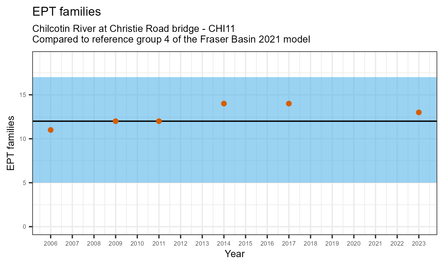 EPT family richness is measured by counting how many taxonomic families belong to one of the pollution sensitive EPT orders: Ephemeroptera (mayflies), Plecoptera (stoneflies), or Trichoptera (caddisflies). EPT family richness may decrease in response to habitat disturbances like poor water quality.
