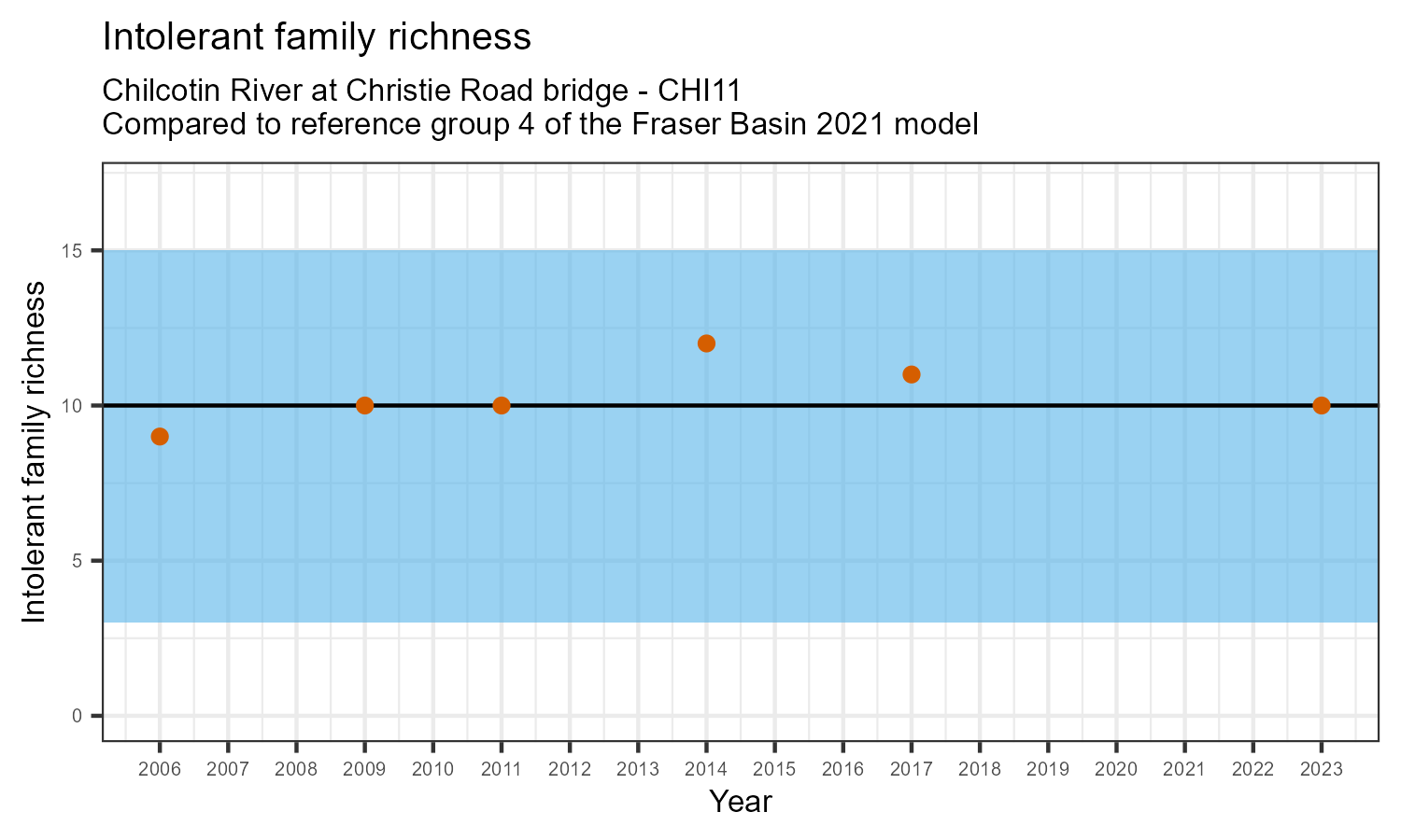 Intolerant family richness counts the number of taxonomic families that are sensitive (intolerant) to pollution, according to the Hilsenhoff Biotic Index. Intolerant family richness may decrease as water pollution increases.