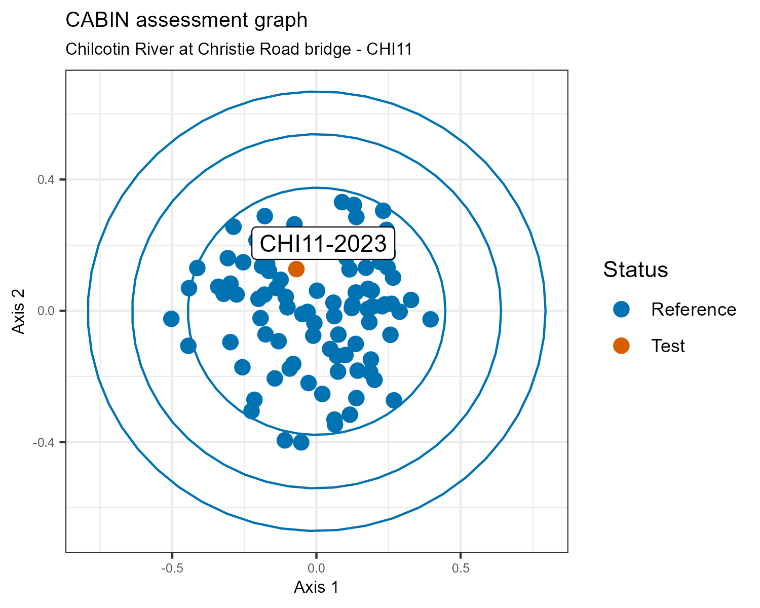 A CABIN assessment considers this water quality monitoring station the “test” site, and compares it to a group of sites with similar habitat features from the Fraser Basin 2021 CABIN reference model. Sites in the reference model have little or no human activity in their watersheds, so they are considered to represent pristine or best possible biological conditions. If the test site is close to the reference sites on the plot, it is also considered to be in good biological condition.