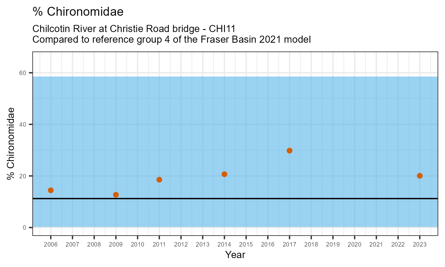 % Chironomidae is the proportion of invertebrates that belong to the taxonomic family Chironomidae. Chironomidae are non-biting midges and are often the most abundant family in a stream. Their pollution tolerance varies widely between different species.
