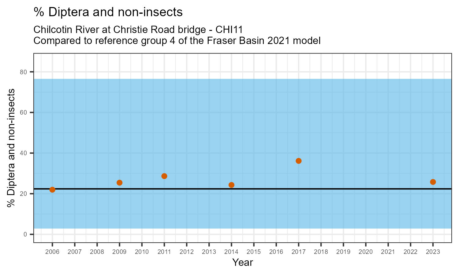 % Diptera and non-insects is the proportion of invertebrates that either are not insects, or are insects in the taxonomic order Diptera. Diptera are flies, and along with non-insects they represent the more pollution tolerant members of the aquatic community. The % Diptera and non-insects may increase in response to habitat disturbances like poor water quality.