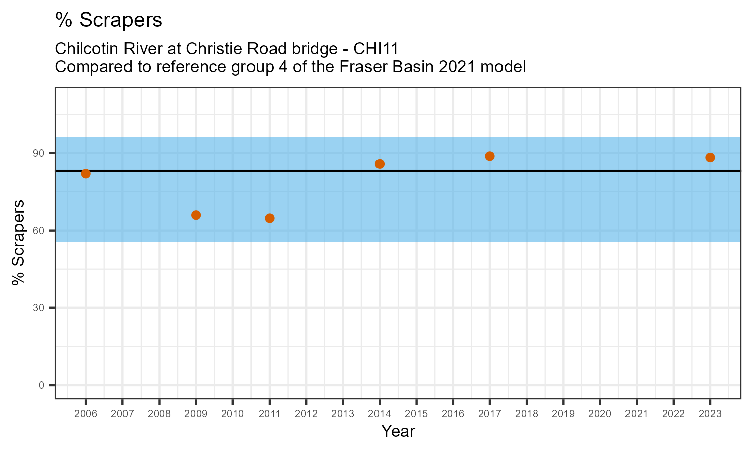% Scrapers is the proportion of taxonomic familes present that feed by grazing on the algae growing on rocks and other underwater surfaces. The proportion of scrapers is expected to decrease at a site in response to disturbance.