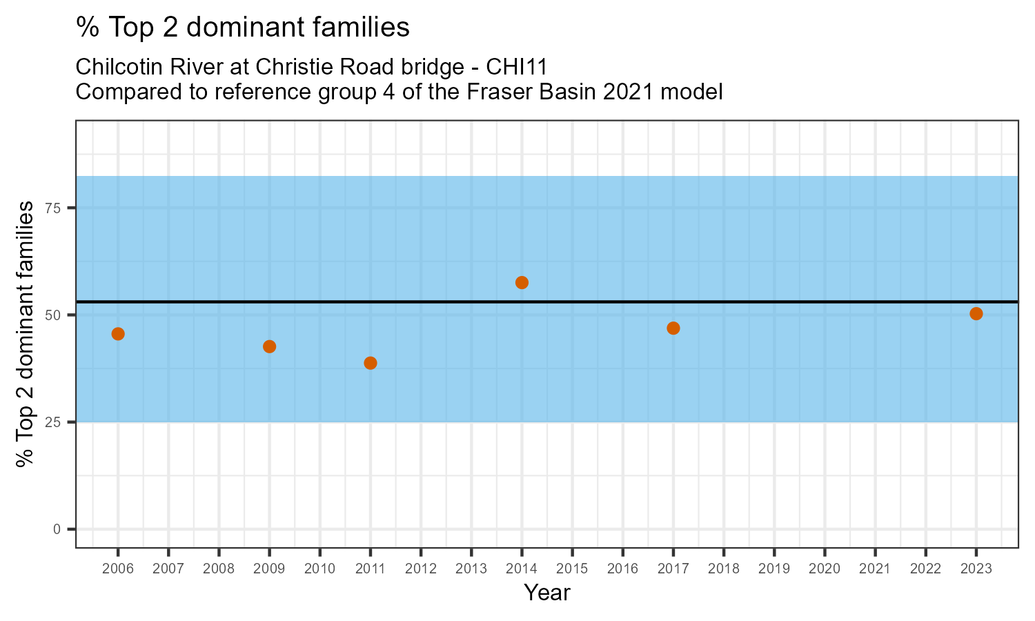 % Top 2 dominant families is the proportion of the total sample represented by the two most abundant families of invertebrates. A healthy aquatic community should have a balance of many types of invertebrates. If only one or two families dominate the community, this can be a sign of habitat disturbance. The percentage of the two most dominant families in the community may increase in response to disturbance.