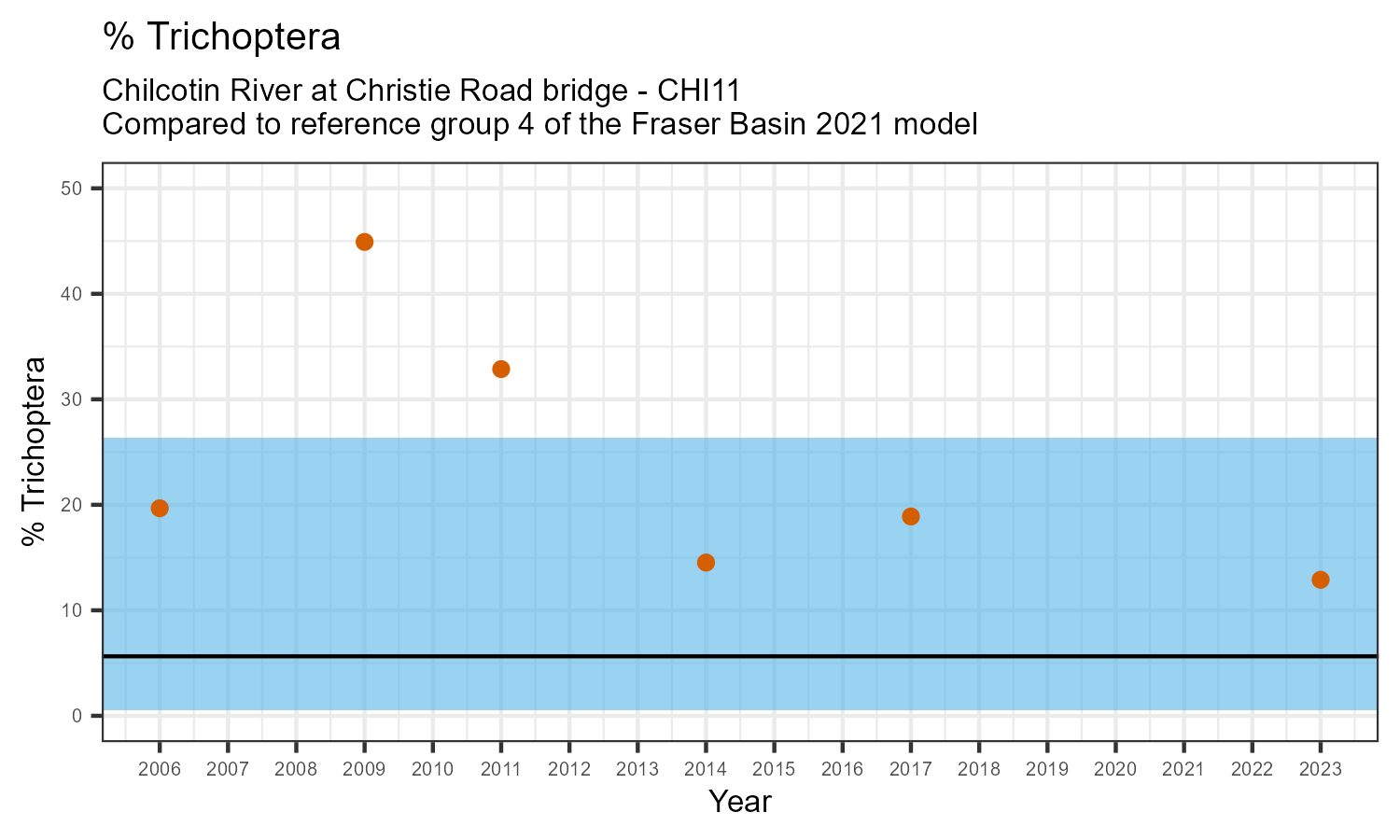 % Trichoptera is the proportion of invertebrates that belong to the taxonomic order Trichoptera. Trichoptera are commonly called caddisflies. They are sensitive to pollution. The % Trichoptera may decrease in response to habitat disturbances like poor water quality.