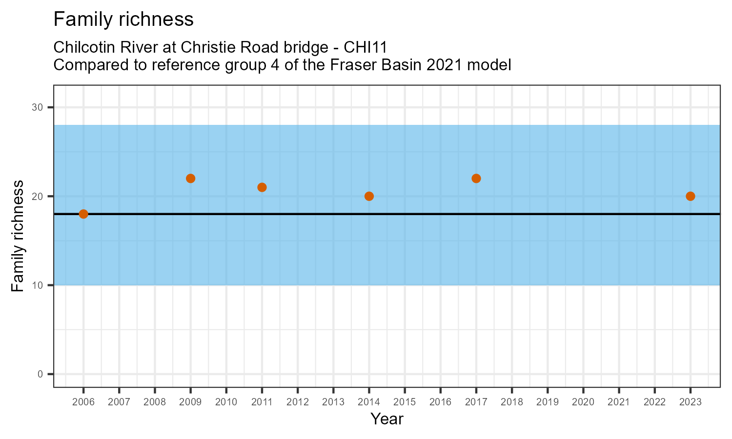 Family richness is the total number of taxonomic families identified. Family richness can decline in response to habitat disturbances or introduction of invasive species.