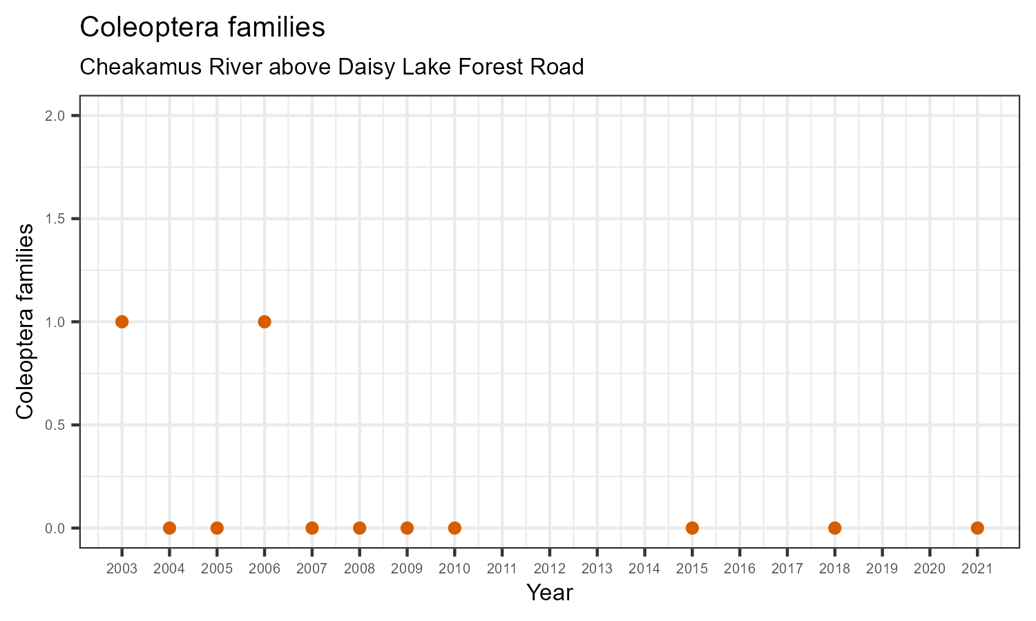 Coleoptera family richness is measured by counting how many taxonomic families belong to the order Coleoptera. Coleoptera are commonly known as beetles, many of which are aquatic or semi-aquatic. They are pollution sensitive, so Coleoptera family richness may decrease in response to habitat disturbances like poor water quality.