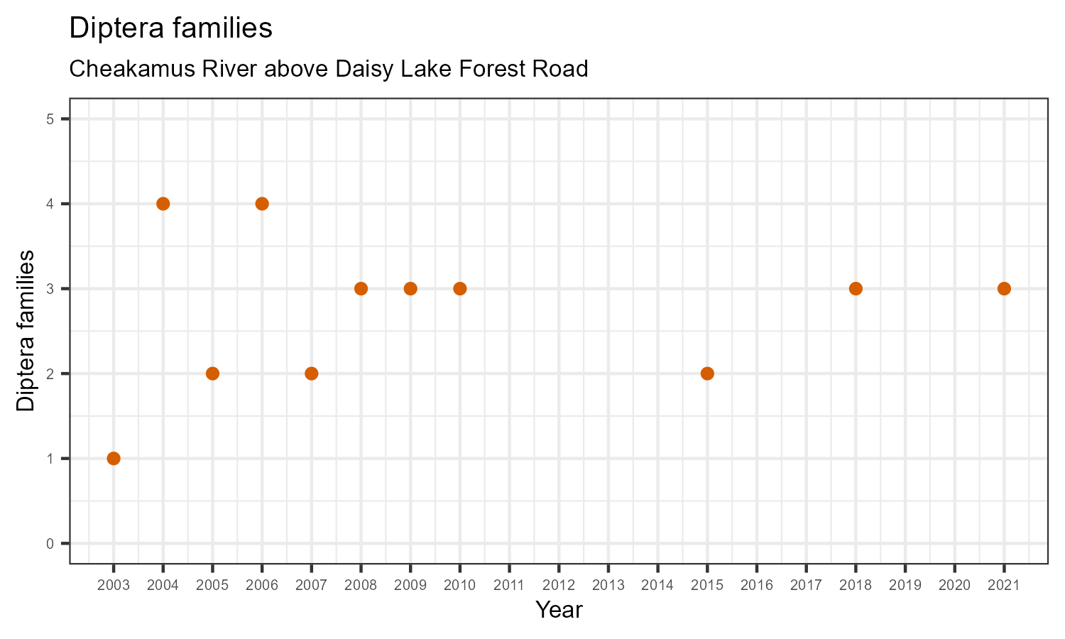 Diptera family richness is measured by counting how many taxonomic families belong to the order Diptera. Diptera are commonly known as flies. Flies tend to be pollution tolerant, so Diptera family richness may increase in response to habitat disturbances like poor water quality.