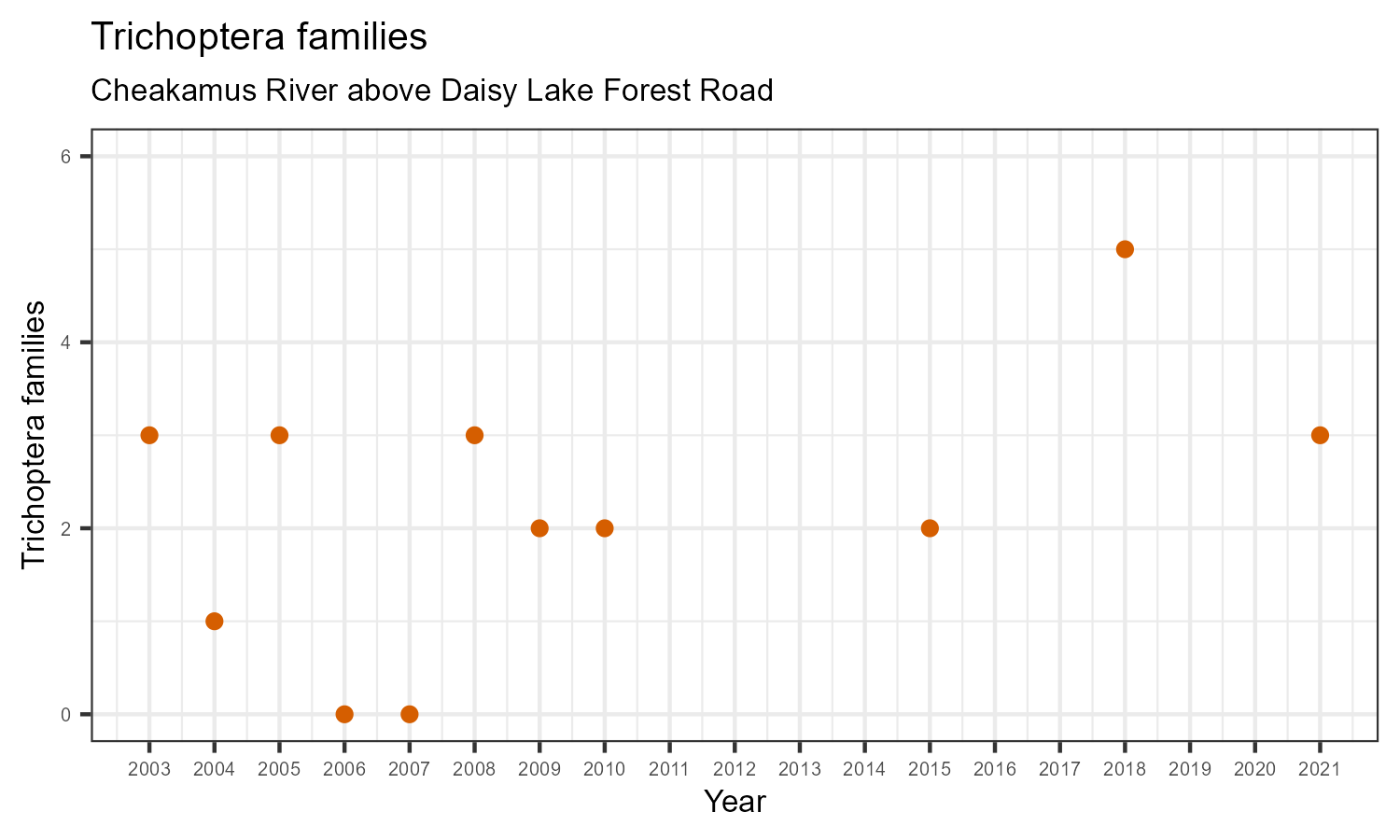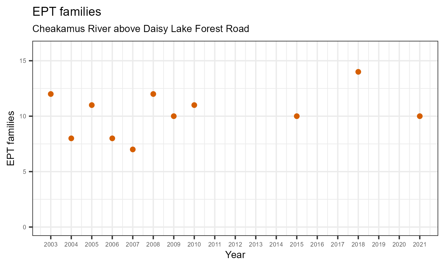 EPT family richness is measured by counting how many taxonomic families belong to one of the pollution sensitive EPT orders: Ephemeroptera (mayflies), Plecoptera (stoneflies), or Trichoptera (caddisflies). EPT family richness may decrease in response to habitat disturbances like poor water quality.