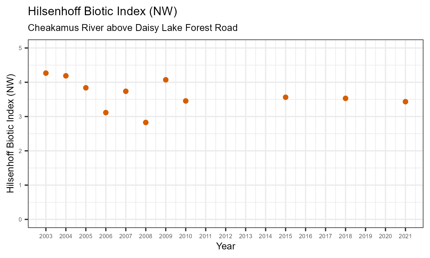 | Hilsenhoff Biotic Index (NW) | 4.07 | 3.46 | 3.56 | 3.53 | 3.43 |