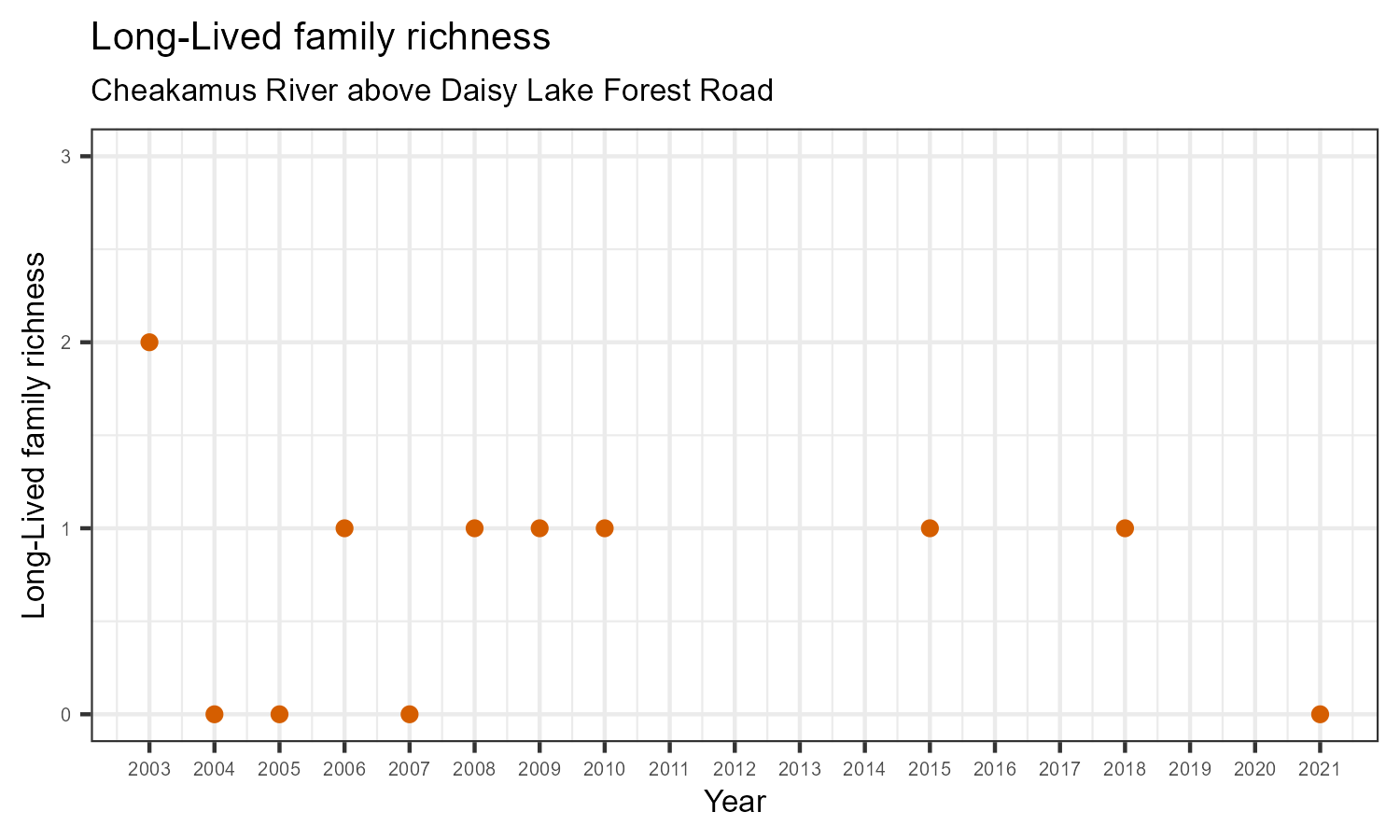 Long-lived family richness counts the number of taxonomic families that need more than 1 year to complete their life cycle. These families have been exposed to conditions in the water over a longer period. They provide information on historical and current water quality conditions. The number of long-lived families may decrease in response to habitat disturbances like poor water quality.