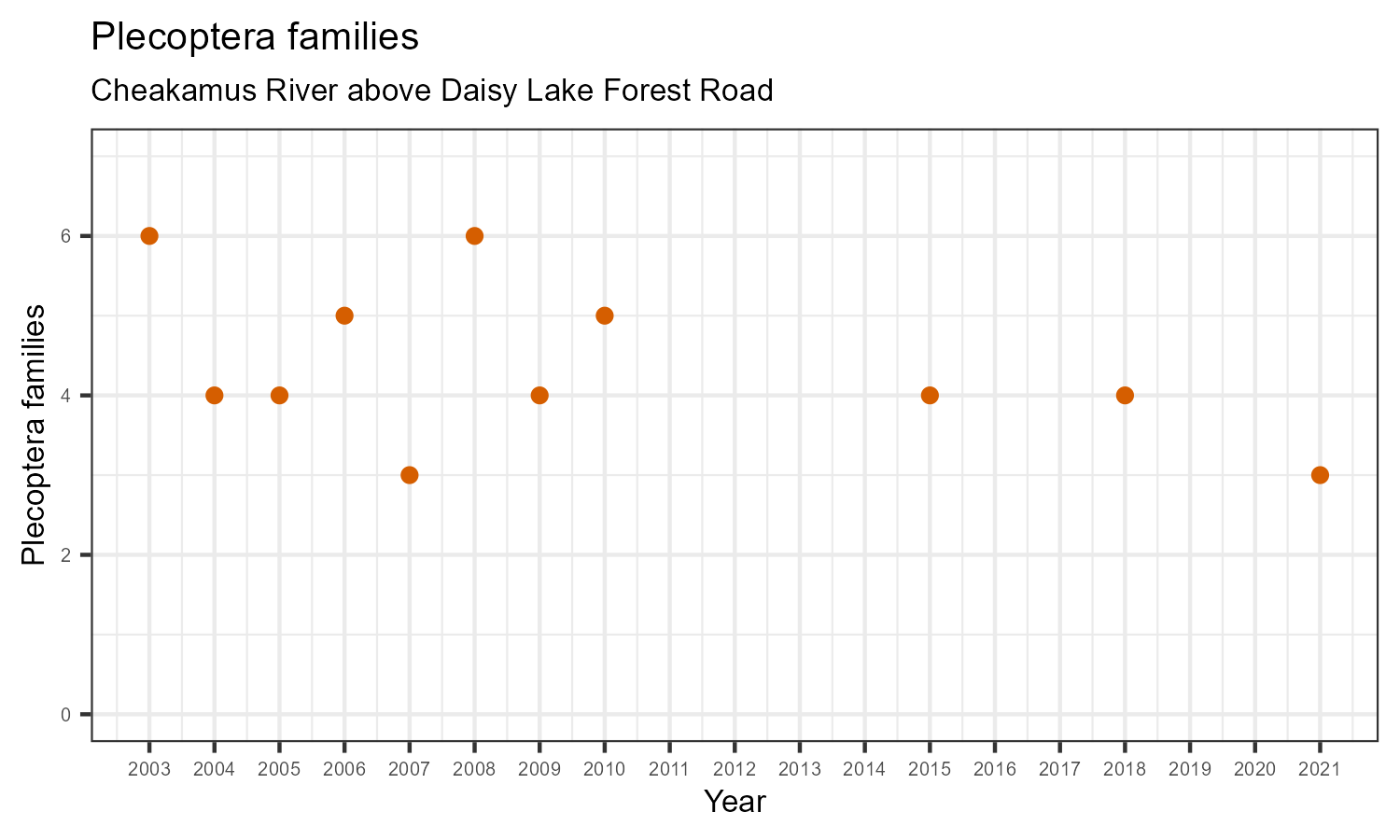 Plecoptera family richness is measured by counting how many taxonomic families in a sample belong to the order Plecoptera. Plecoptera are commonly known as stoneflies. They are pollution sensitive, so Plecoptera family richness may decrease in response to habitat disturbances like poor water quality.