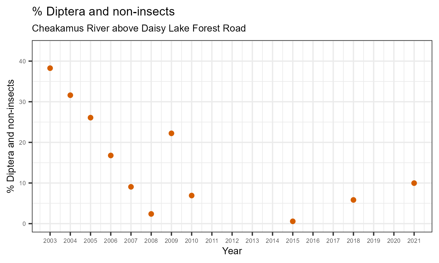 % Diptera and non-insects is the proportion of invertebrates that either are not insects, or are insects in the taxonomic order Diptera. Diptera are flies, and along with non-insects they represent the more pollution tolerant members of the aquatic community. The % Diptera and non-insects may increase in response to habitat disturbances like poor water quality.