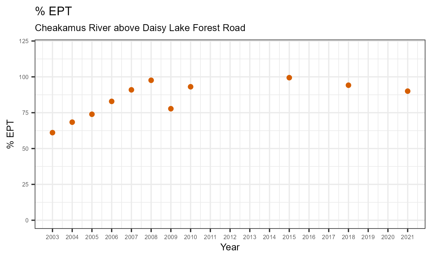 % EPT is the proportion of invertebrates that belong to one of the taxonomic orders of Ephemeroptera (mayflies), Plecoptera (stoneflies), or Trichoptera (caddisflies). These types of insects are often grouped together under the term “EPT”. They are typically the most sensitive to habitat disturbances like poor water quality.