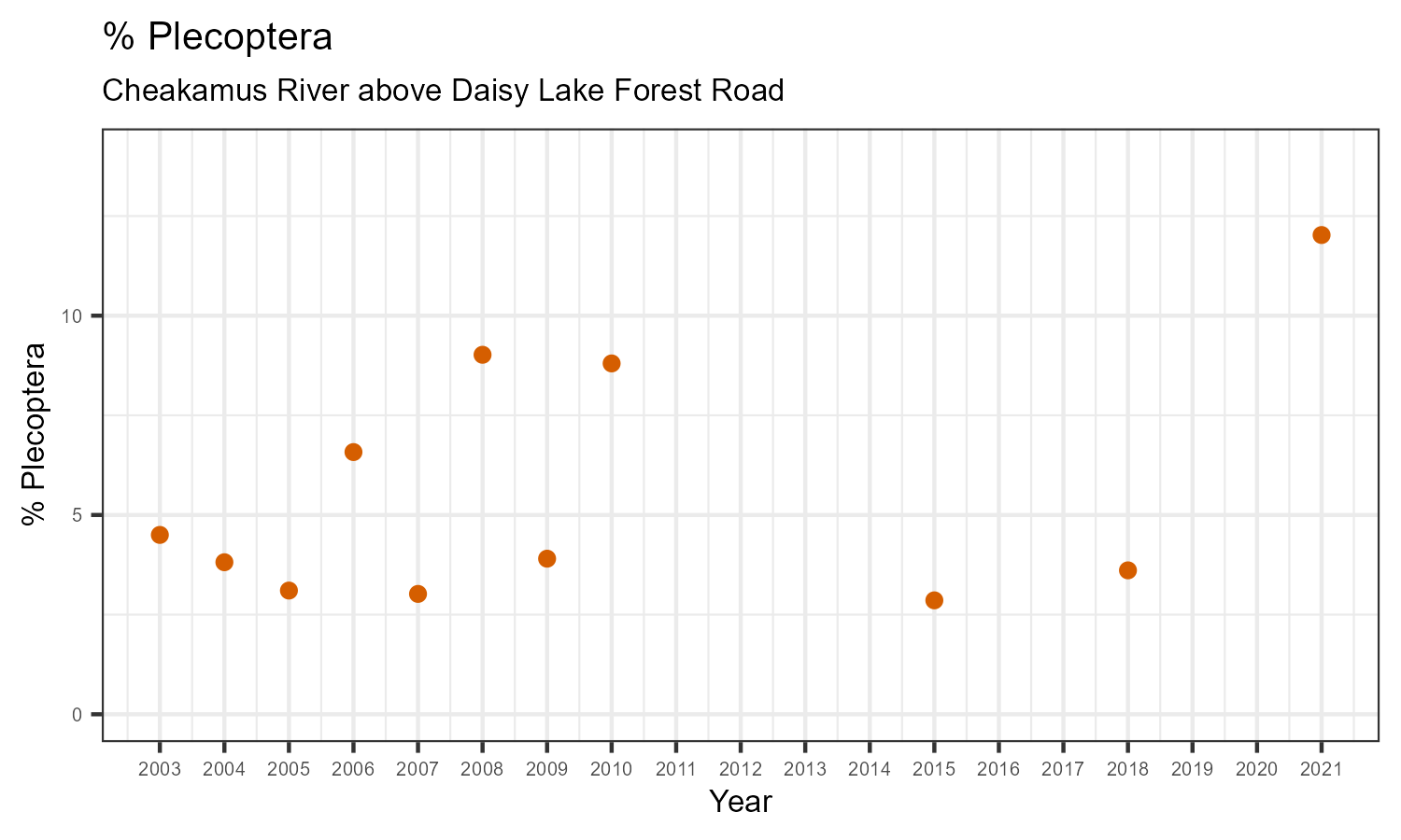 % Plecoptera is the proportion of invertebrates that belong to the taxonomic order Plecoptera. Plecoptera are commonly called stoneflies. They are sensitive to pollution. The % Plecoptera may decrease in response to habitat disturbances like poor water quality.