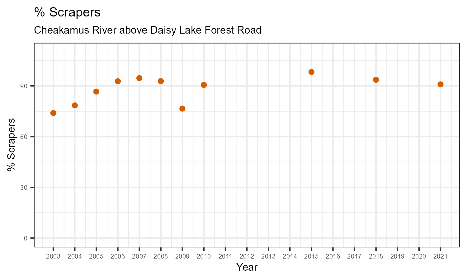 % Scrapers is the proportion of taxonomic familes present that feed by grazing on the algae growing on rocks and other underwater surfaces. The proportion of scrapers is expected to decrease at a site in response to disturbance.
