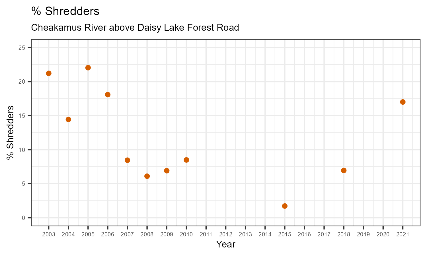 % Shredders is the proportion of taxonomic familes present that feed on leaf litter and other coarse particulate organic matter in the water. The proportion of shredders is expected to decrease at a site in response to disturbance.
