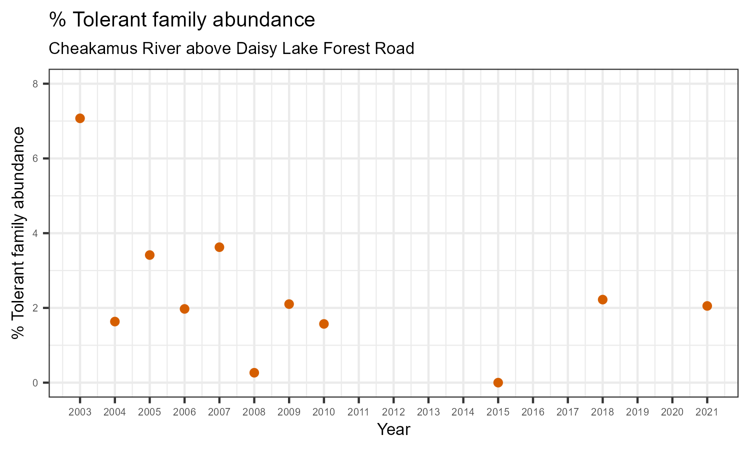 % Tolerant family abundance is the proportion of taxonomic families that are tolerant to pollution, according to the Hilsenhoff Biotic Index. The % tolerant family abundance may increase as water pollution increases.
