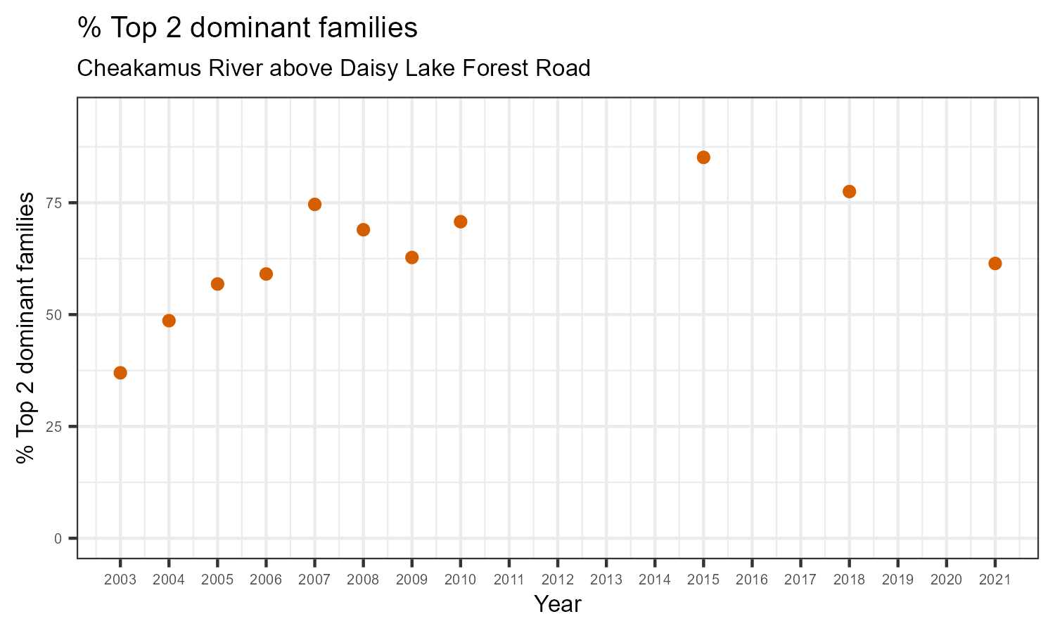 % Top 2 dominant families is the proportion of the total sample represented by the two most abundant families of invertebrates. A healthy aquatic community should have a balance of many types of invertebrates. If only one or two families dominate the community, this can be a sign of habitat disturbance. The percentage of the two most dominant families in the community may increase in response to disturbance.