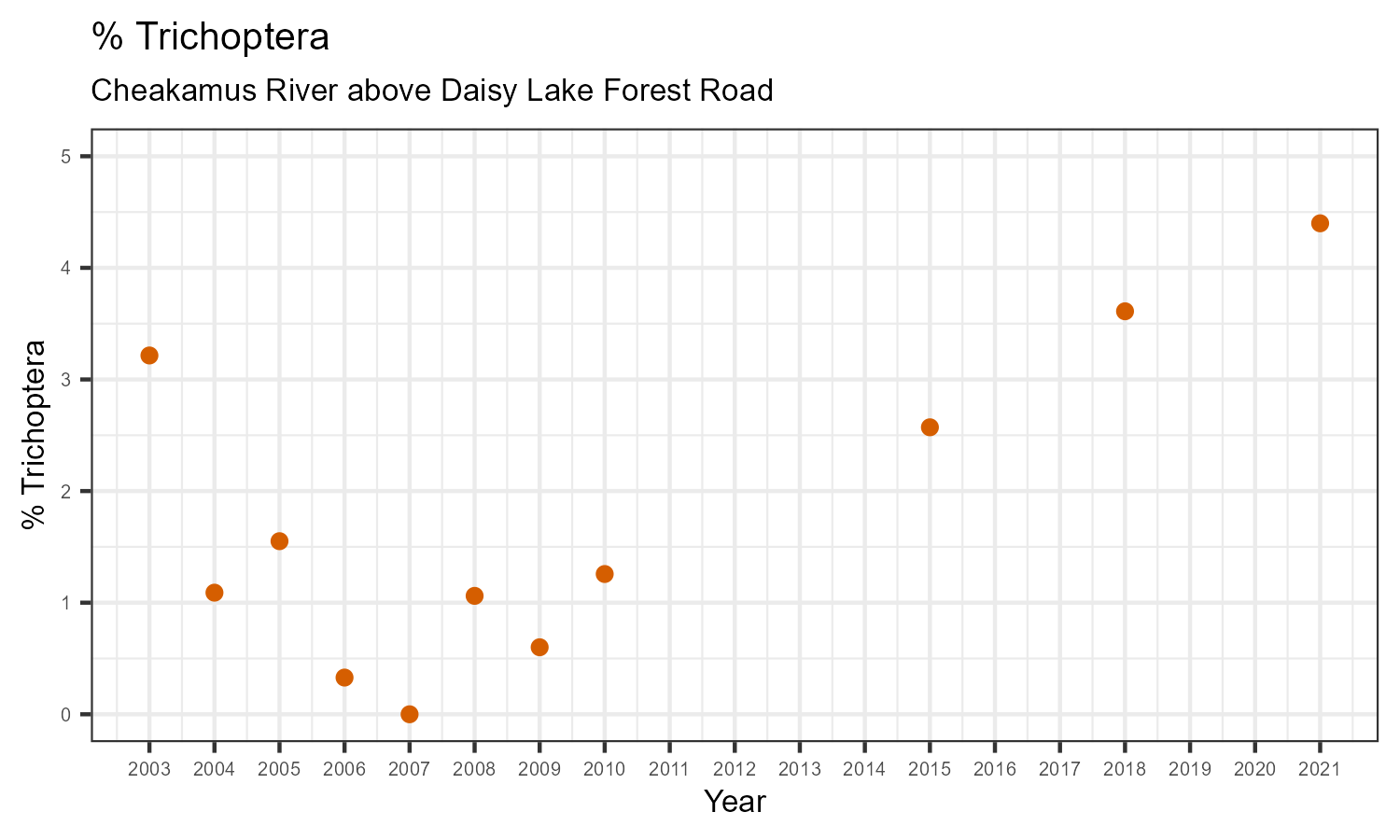 % Trichoptera is the proportion of invertebrates that belong to the taxonomic order Trichoptera. Trichoptera are commonly called caddisflies. They are sensitive to pollution. The % Trichoptera may decrease in response to habitat disturbances like poor water quality.