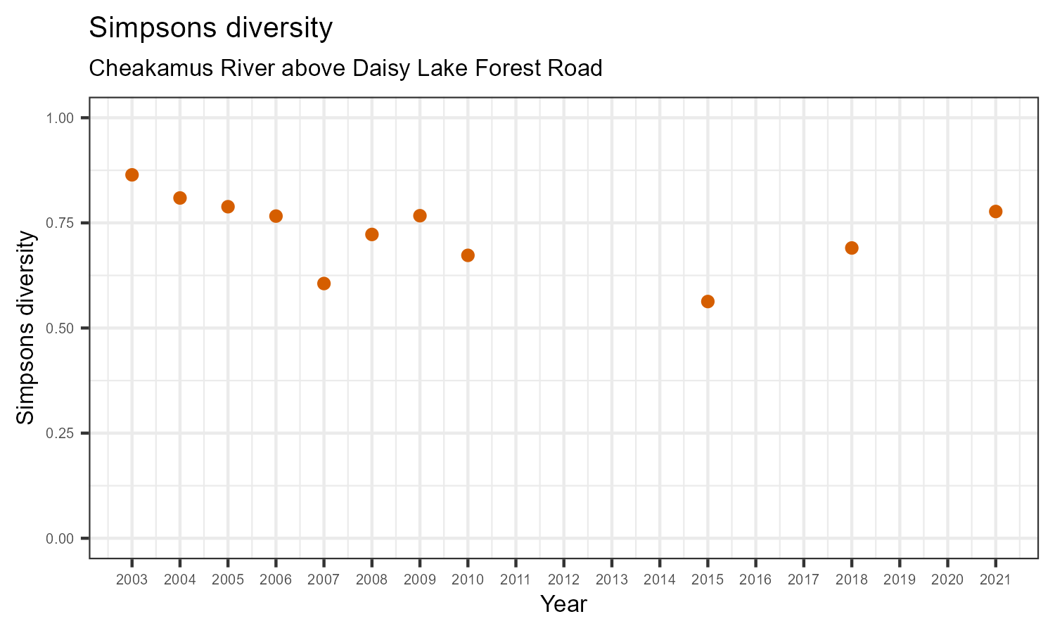 Simpson’s evenness is an index that measures whether the number of individuals in various taxonomic families is similar, or balanced. Balanced communities are an indicator of a healthy ecosystem. Simpson’s evenness may decrease in response to habitat disturbances.