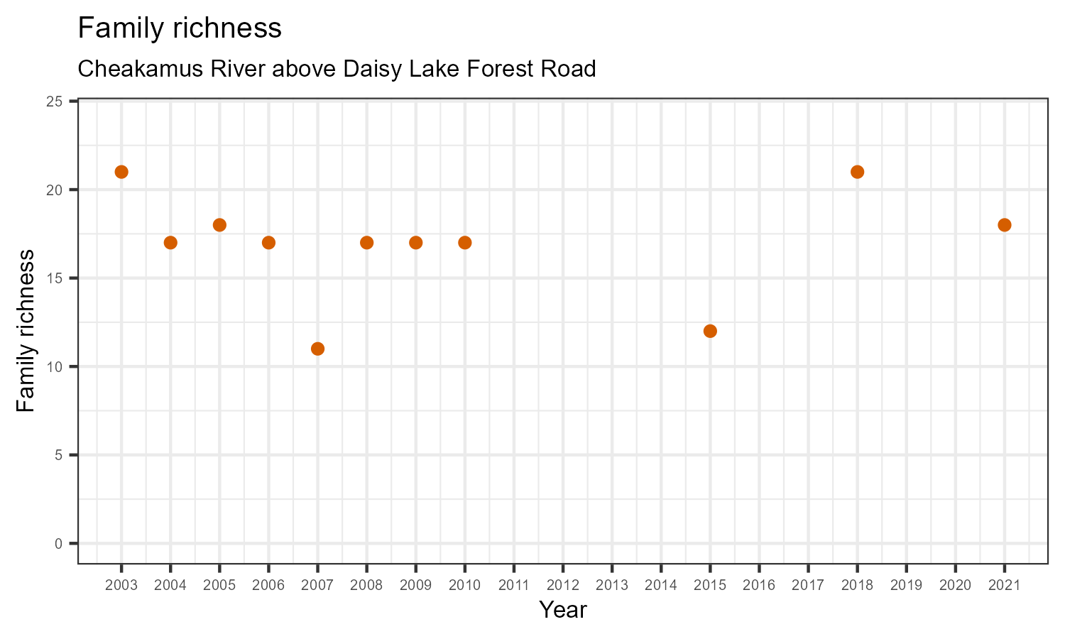 Family richness is the total number of taxonomic families identified. Family richness can decline in response to habitat disturbances or introduction of invasive species.