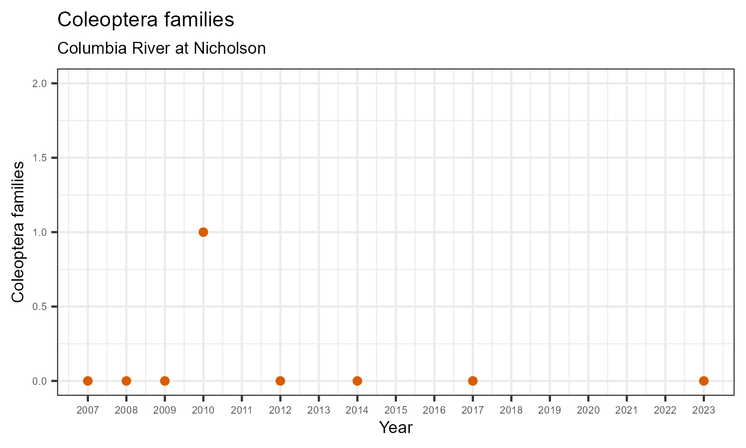 Coleoptera family richness is measured by counting how many taxonomic families belong to the order Coleoptera. Coleoptera are commonly known as beetles, many of which are aquatic or semi-aquatic. They are pollution sensitive, so Coleoptera family richness may decrease in response to habitat disturbances like poor water quality.