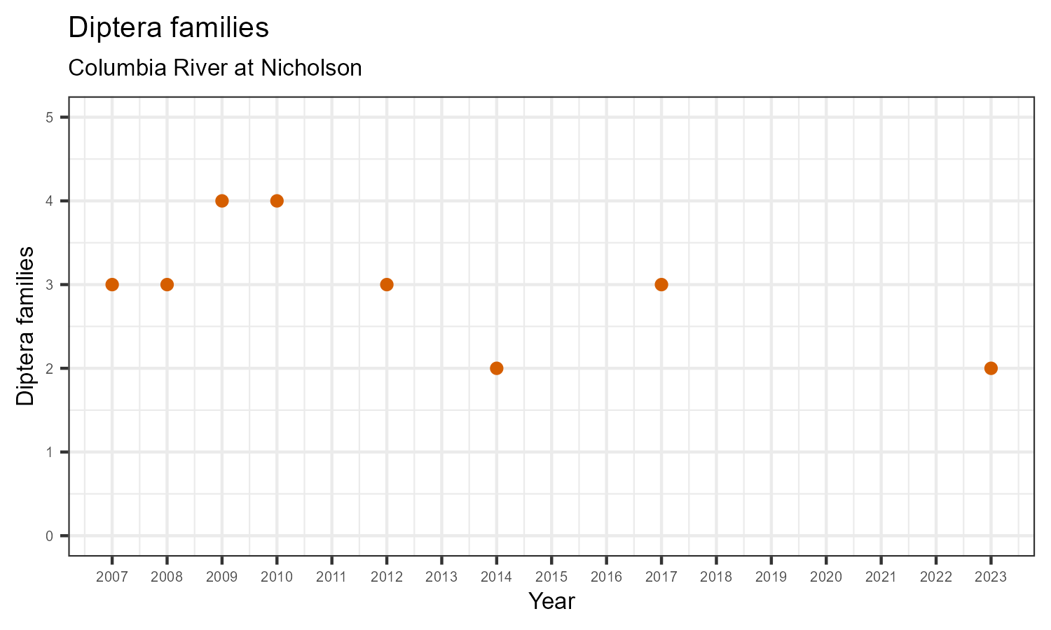 Diptera family richness is measured by counting how many taxonomic families belong to the order Diptera. Diptera are commonly known as flies. Flies tend to be pollution tolerant, so Diptera family richness may increase in response to habitat disturbances like poor water quality.