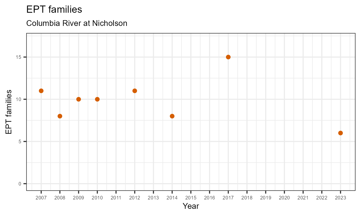 EPT family richness is measured by counting how many taxonomic families belong to one of the pollution sensitive EPT orders: Ephemeroptera (mayflies), Plecoptera (stoneflies), or Trichoptera (caddisflies). EPT family richness may decrease in response to habitat disturbances like poor water quality.