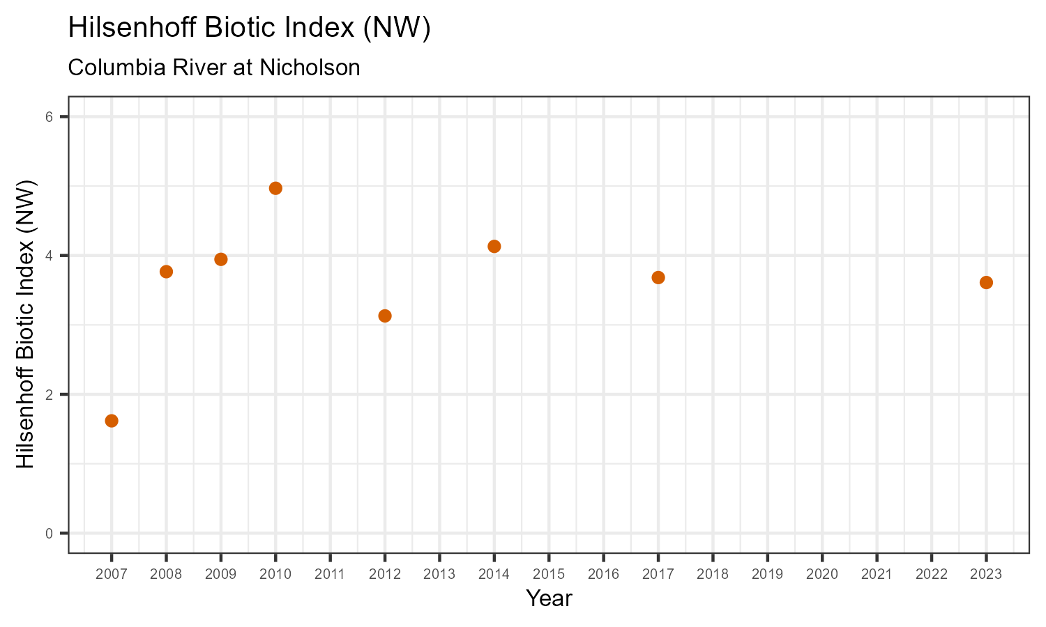Hilsenhoff Biotic Index (NW) calculates a value based on the invertebrates present, their abundances, and their tolerance (or intolerance) to water pollution. Sensitive (intolerant) invertebrates receive low scores, and tolerant ones receive high scores. This index produces a value between 0 and 10, where 0 indicates excellent water quality and 10 indicates very poor water quality. The Hilsenhoff Biotic Index tolerance values are specific to the geographic area for which they were developed - in this case, northwest North America.