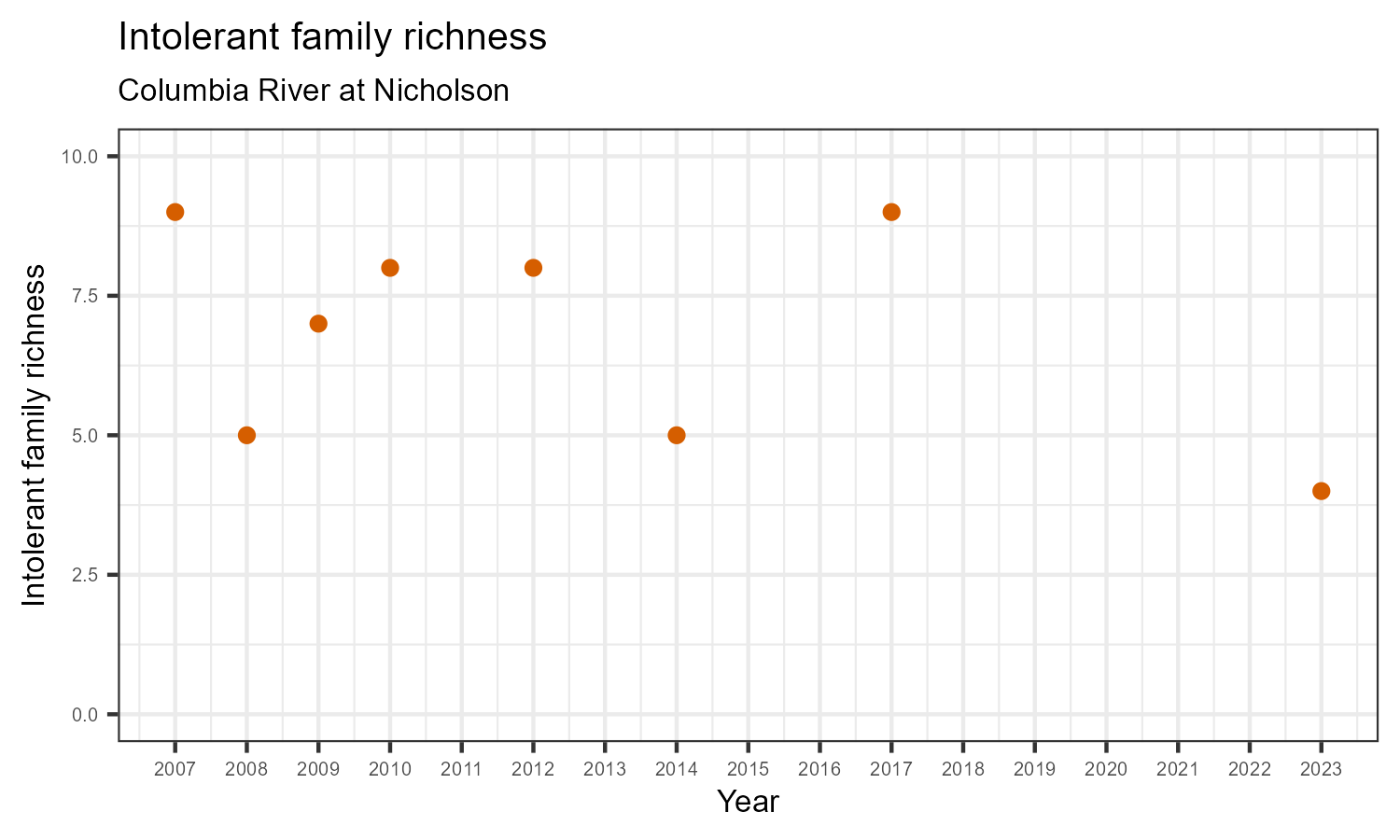 Intolerant family richness counts the number of taxonomic families that are sensitive (intolerant) to pollution, according to the Hilsenhoff Biotic Index. Intolerant family richness may decrease as water pollution increases.