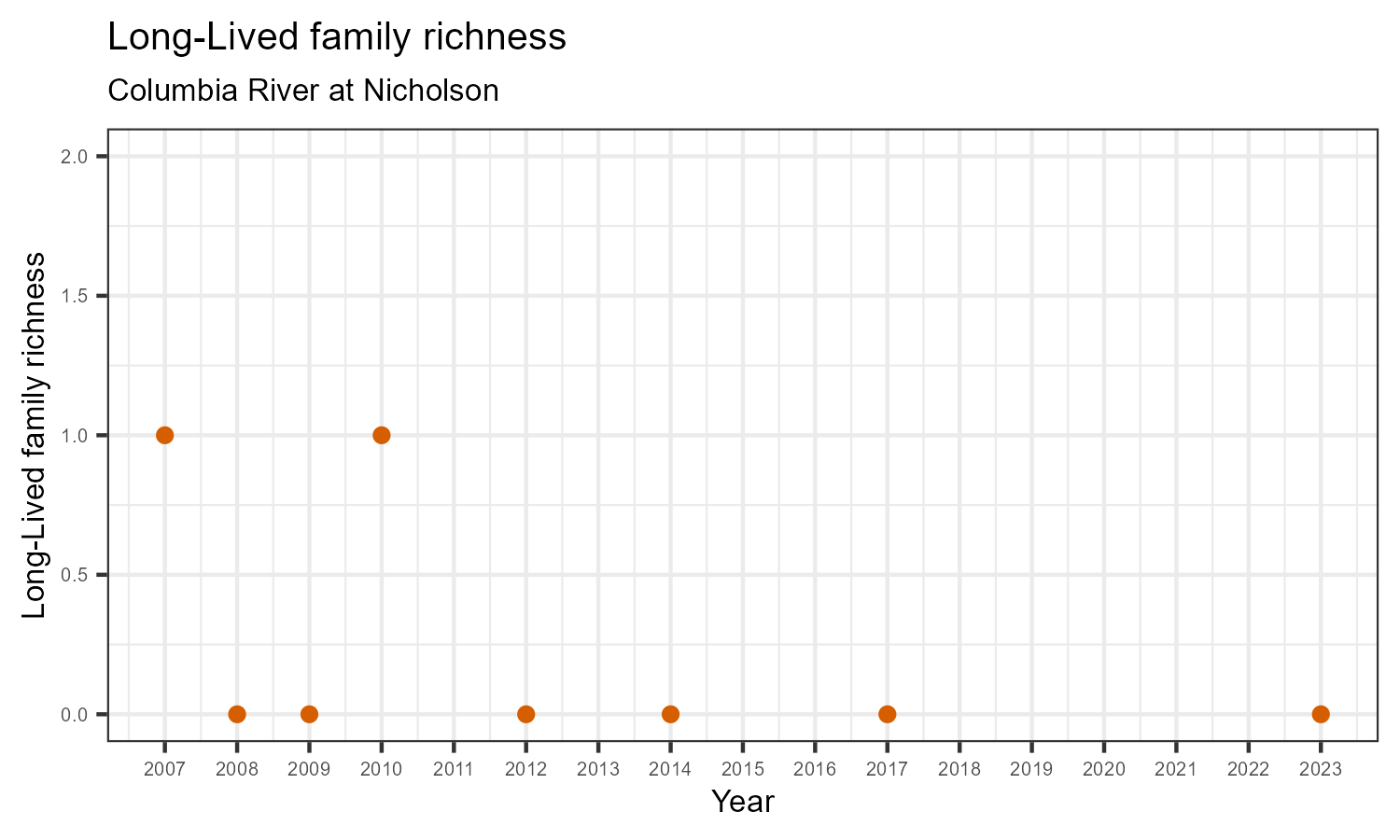 Long-lived family richness counts the number of taxonomic families that need more than 1 year to complete their life cycle. These families have been exposed to conditions in the water over a longer period. They provide information on historical and current water quality conditions. The number of long-lived families may decrease in response to habitat disturbances like poor water quality.