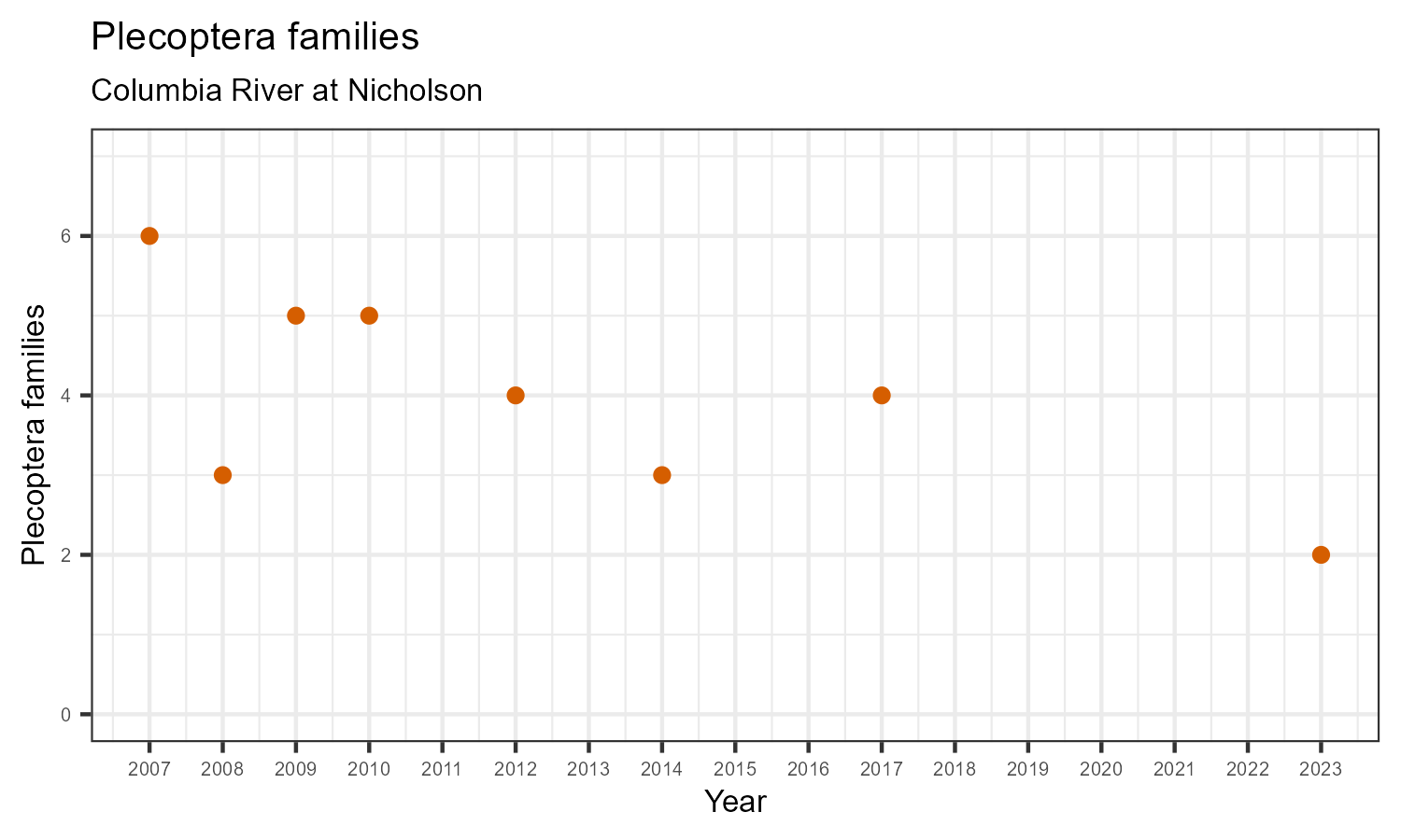 Plecoptera family richness is measured by counting how many taxonomic families in a sample belong to the order Plecoptera. Plecoptera are commonly known as stoneflies. They are pollution sensitive, so Plecoptera family richness may decrease in response to habitat disturbances like poor water quality.