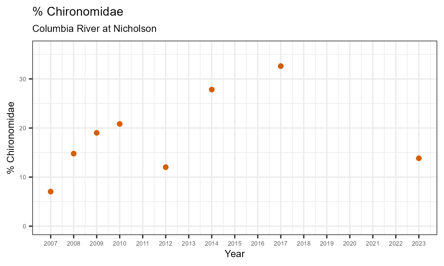 % Chironomidae is the proportion of invertebrates that belong to the taxonomic family Chironomidae. Chironomidae are non-biting midges and are often the most abundant family in a stream. Their pollution tolerance varies widely between different species.